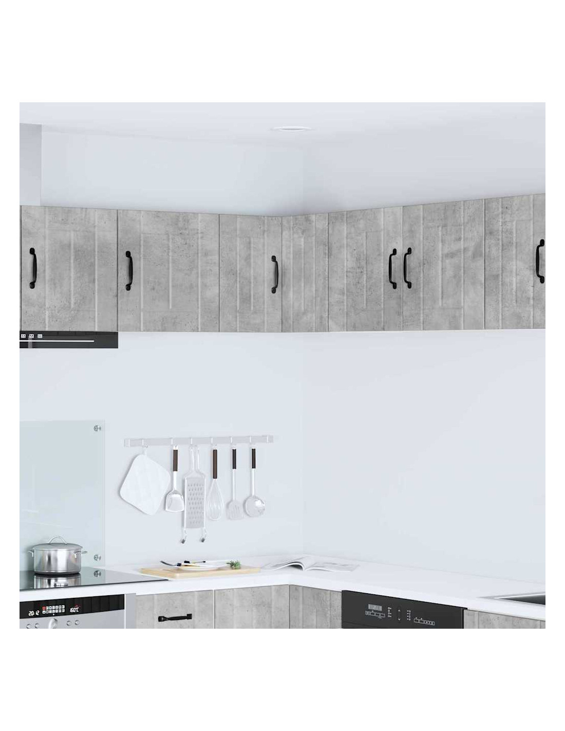 - Porte a cerniera:Le porte a cerniera rendono l'apertura fluida. Sono eleganti e si integrano perfettamente nelle cucine moderne. Le maniglie a barra nera offrono un bel contrasto e sono pratiche.