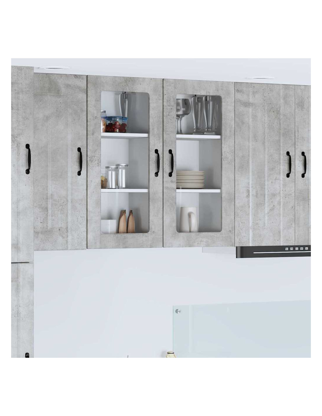 - Porte a cerniera:Le porte a cerniera rendono l'apertura fluida. Sono eleganti e si integrano perfettamente nelle cucine moderne. Le maniglie a barra nera offrono un bel contrasto e sono pratiche.