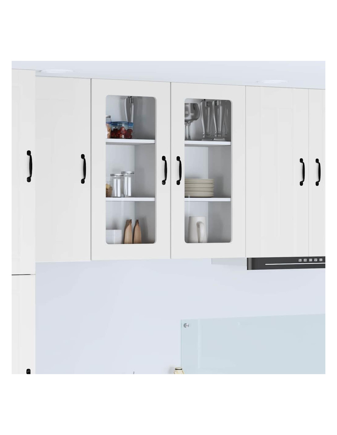 - Porte a cerniera:Le porte a cerniera rendono l'apertura fluida. Sono eleganti e si integrano perfettamente nelle cucine moderne. Le maniglie a barra nera offrono un bel contrasto e sono pratiche.