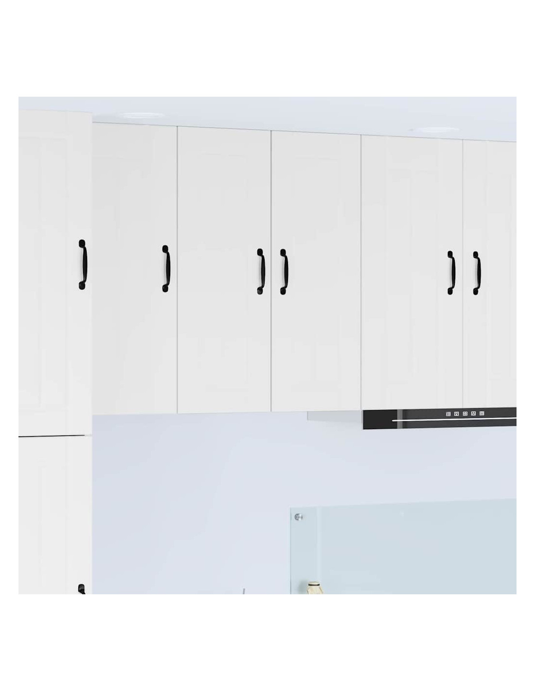 - Porte a cerniera:Le porte a cerniera rendono l'apertura fluida. Sono eleganti e si integrano perfettamente nelle cucine moderne. Le maniglie a barra nera offrono un bel contrasto e sono pratiche.