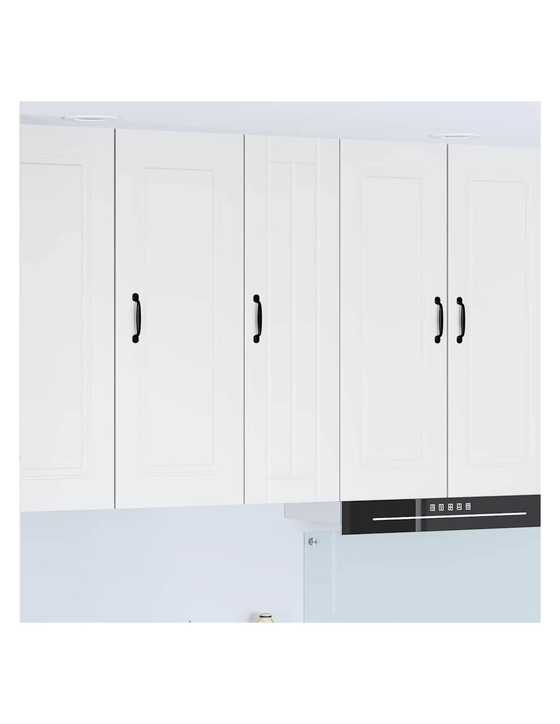 - Porte a cerniera:Le porte a cerniera rendono l'apertura fluida. Sono eleganti e si integrano perfettamente nelle cucine moderne. Le maniglie a barra nera offrono un bel contrasto e sono pratiche.