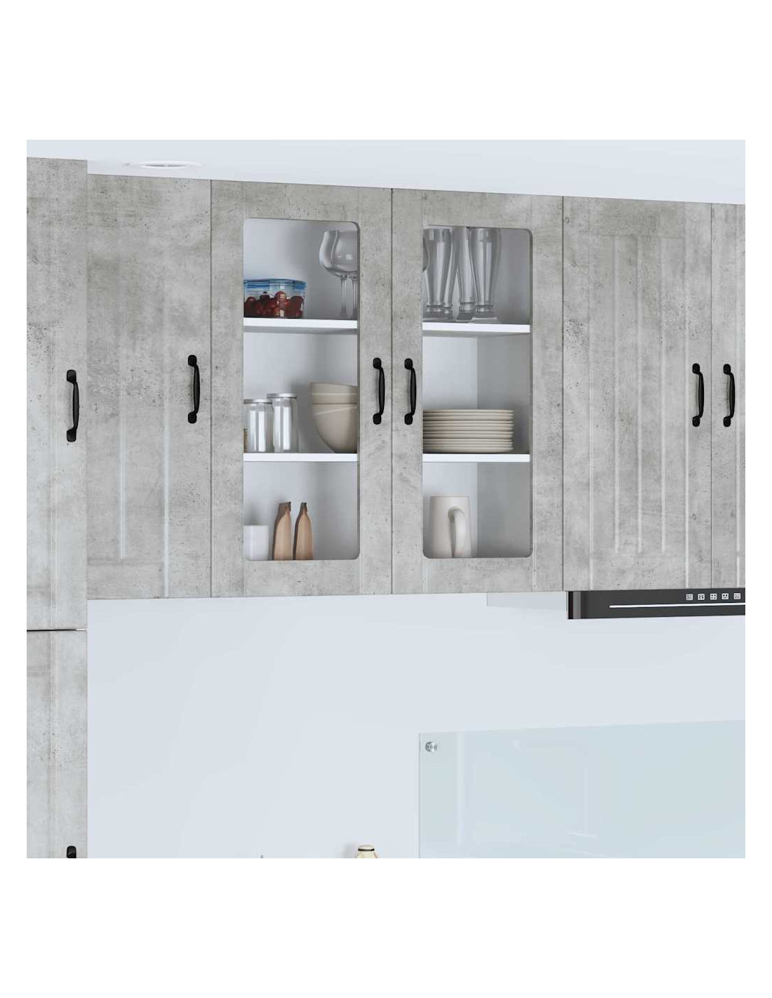 - Porte a cerniera:Le porte a cerniera rendono l'apertura fluida. Sono eleganti e si integrano perfettamente nelle cucine moderne. Le maniglie a barra nera offrono un bel contrasto e sono pratiche.