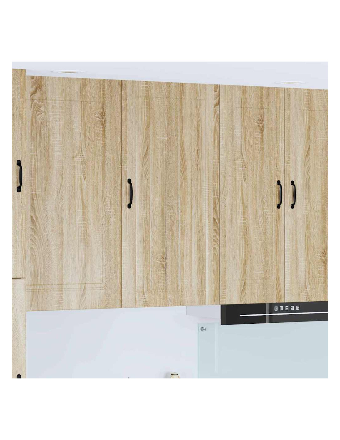 - Porte a cerniera:Le porte a cerniera rendono l'apertura fluida. Sono eleganti e si integrano perfettamente nelle cucine moderne. Le maniglie a barra nera offrono un bel contrasto e sono pratiche.