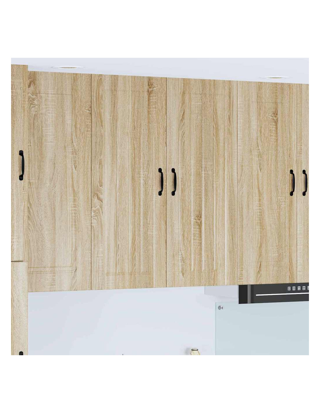 - Porte a cerniera:Le porte a cerniera rendono l'apertura fluida. Sono eleganti e si integrano perfettamente nelle cucine moderne. Le maniglie a barra nera offrono un bel contrasto e sono pratiche.