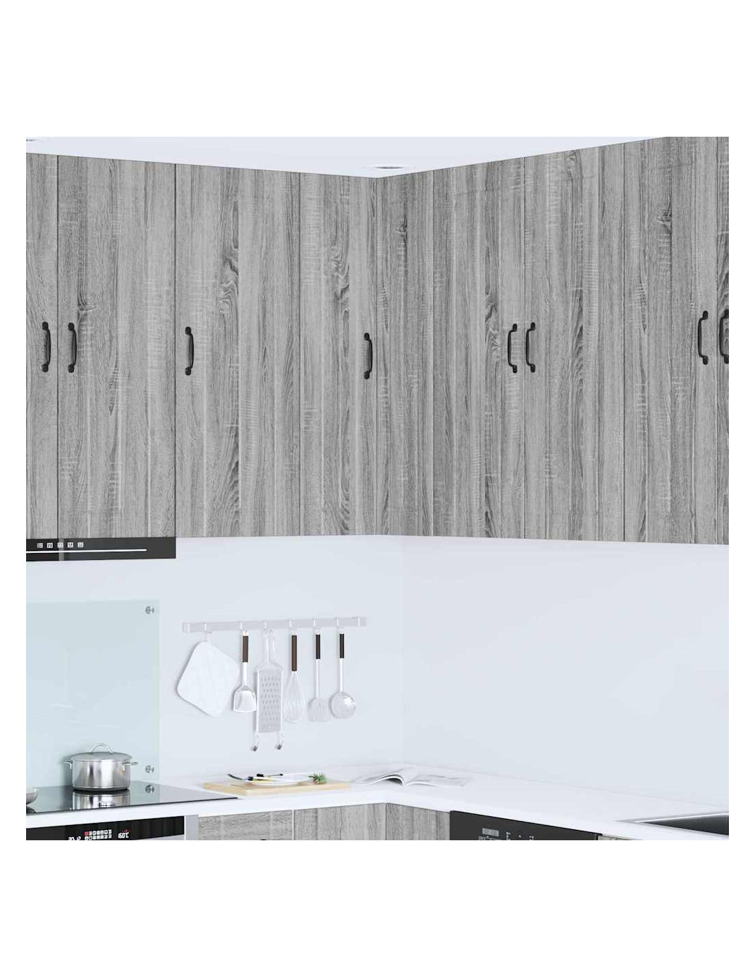 - Porte a cerniera:Le porte a cerniera rendono l'apertura fluida. Sono eleganti e si integrano perfettamente nelle cucine moderne. Le maniglie a barra nera offrono un bel contrasto e sono pratiche.