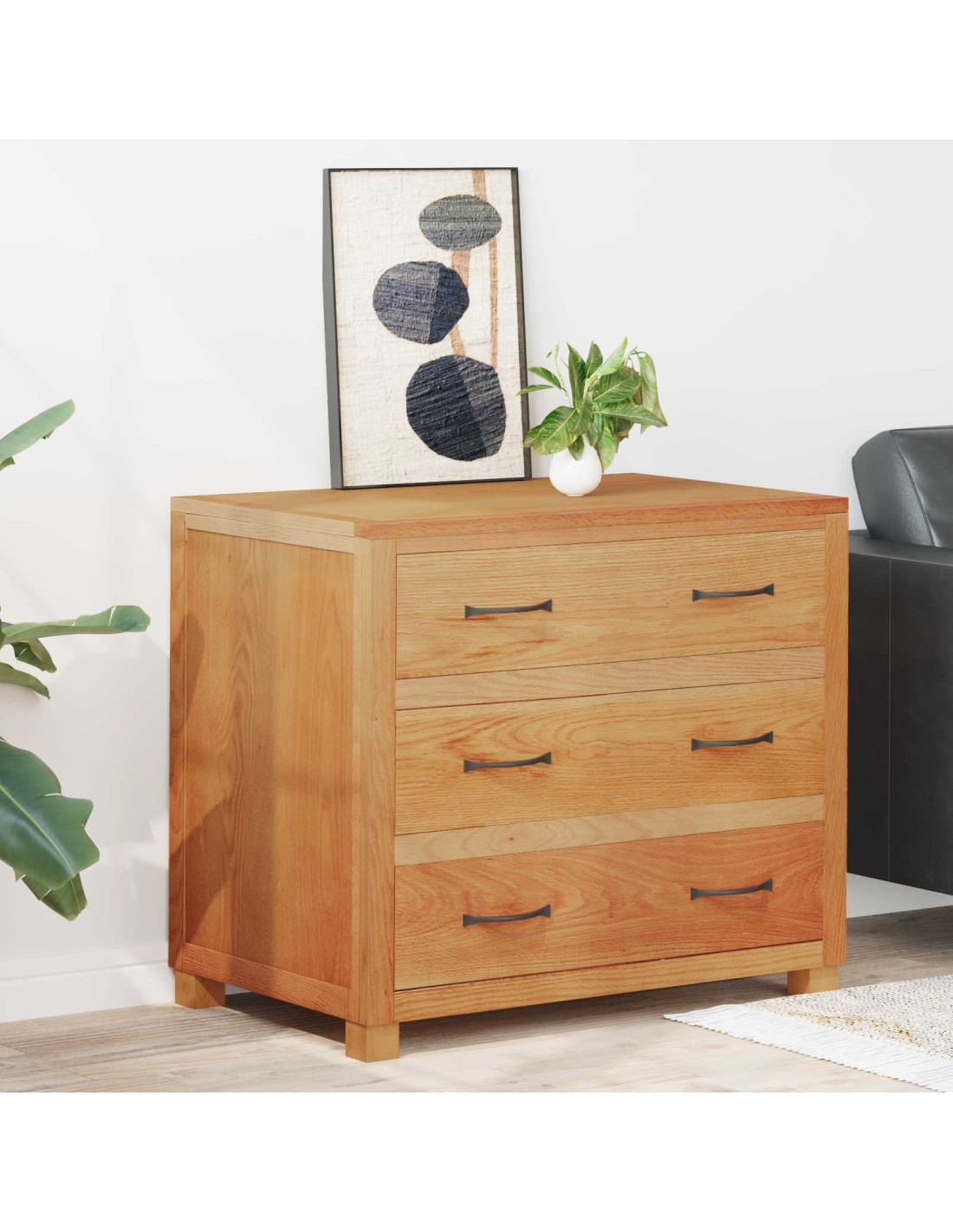 - Materiali: È fatto con legno ingegnerizzato e rovere massello, con parti in pino massello, che lo rendono sia robusto che elegante. Questa combinazione assicura una struttura resistente per l'uso quotidiano e migliora anche l'aspetto del mobile.