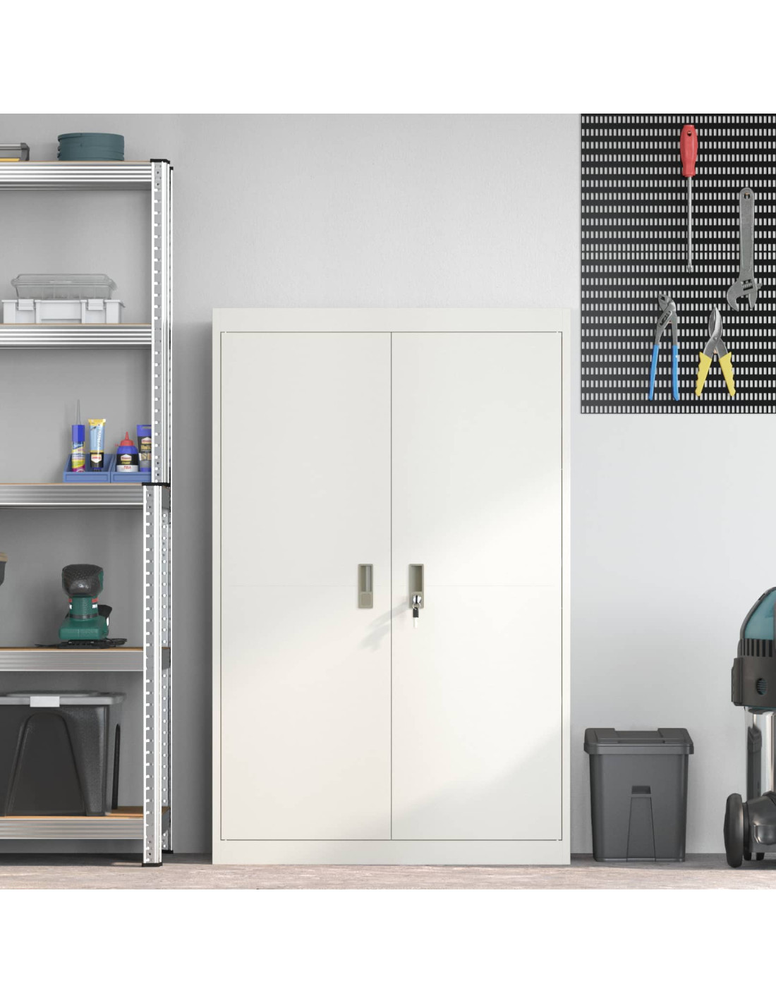Questo armadio di stoccaggio è la soluzione moderna perfetta per organizzare il tuo ufficio con stile. Con un tocco di design industriale, combina funzionalità e bellezza, ideale per chi cerca robusti sistemi di stoccaggio. La struttura in acciaio, completata da una verniciatura a polvere, non solo è bella, ma la rende anche resistente nel tempo.