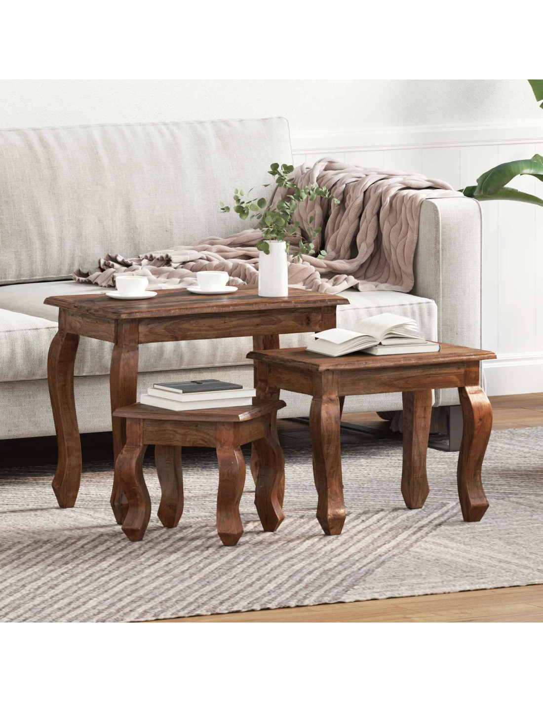 - Componenti Inclusi: Il set include tre tavoli di dimensioni diverse. Possono essere impilati quando non usati, massimizzando spazio e funzionalità e creando un'armonia decorativa quando usati separatamente.