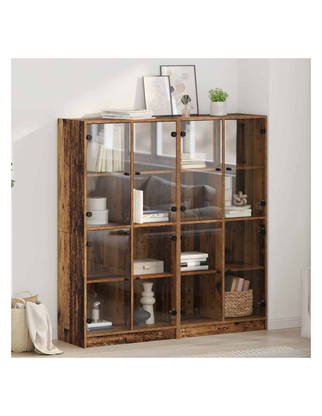 - Componenti Inclusi: Questa credenza ha porte in PVC trasparente, pomelli in metallo opaco per un tocco raffinato e mensole in legno ingegnerizzato. Questi elementi creano un'unità di stoccaggio coerente e pratica, perfetta per tenere in ordine il soggiorno.
