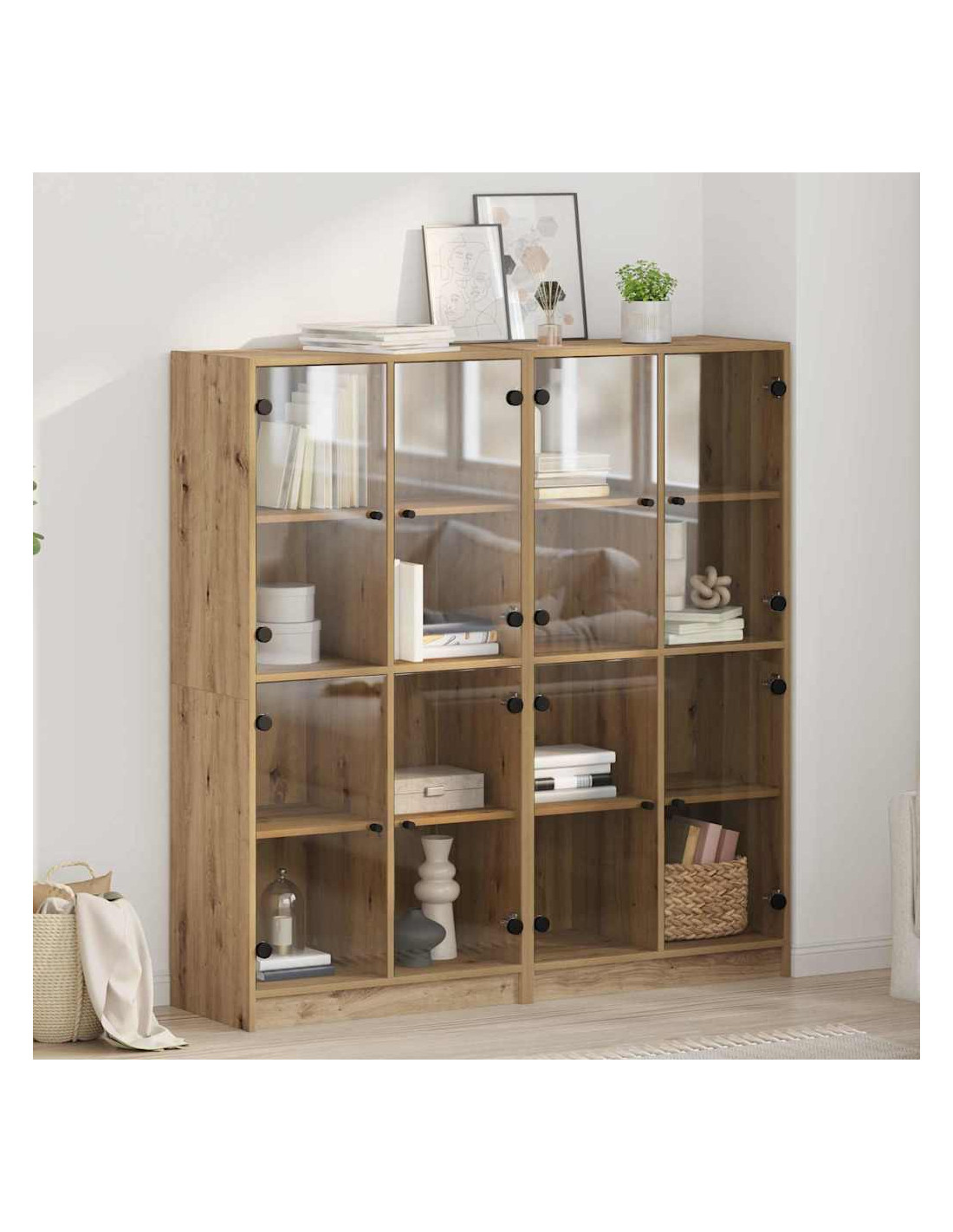 - Componenti Inclusi: Questa credenza ha porte in PVC trasparente, pomelli in metallo opaco per un tocco raffinato e mensole in legno ingegnerizzato. Questi elementi creano un'unità di stoccaggio coerente e pratica, perfetta per tenere in ordine il soggiorno.