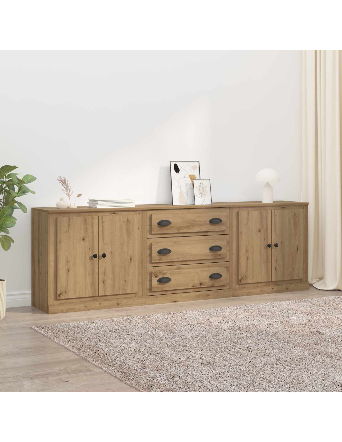 Il set di credenze moderne è un pezzo di design che può trasformare il tuo soggiorno. Con tanto spazio per riporre e un'estetica minimalista, questa credenza si inserisce facilmente negli interni moderni, offrendo funzionalità e un tocco di eleganza. Perfetta per riporre la zona pranzo o per esporre oggetti decorativi, la forma lunga e rettangolare in legno ingegnerizzato e trasparente porta equilibrio tra eleganza e praticità.