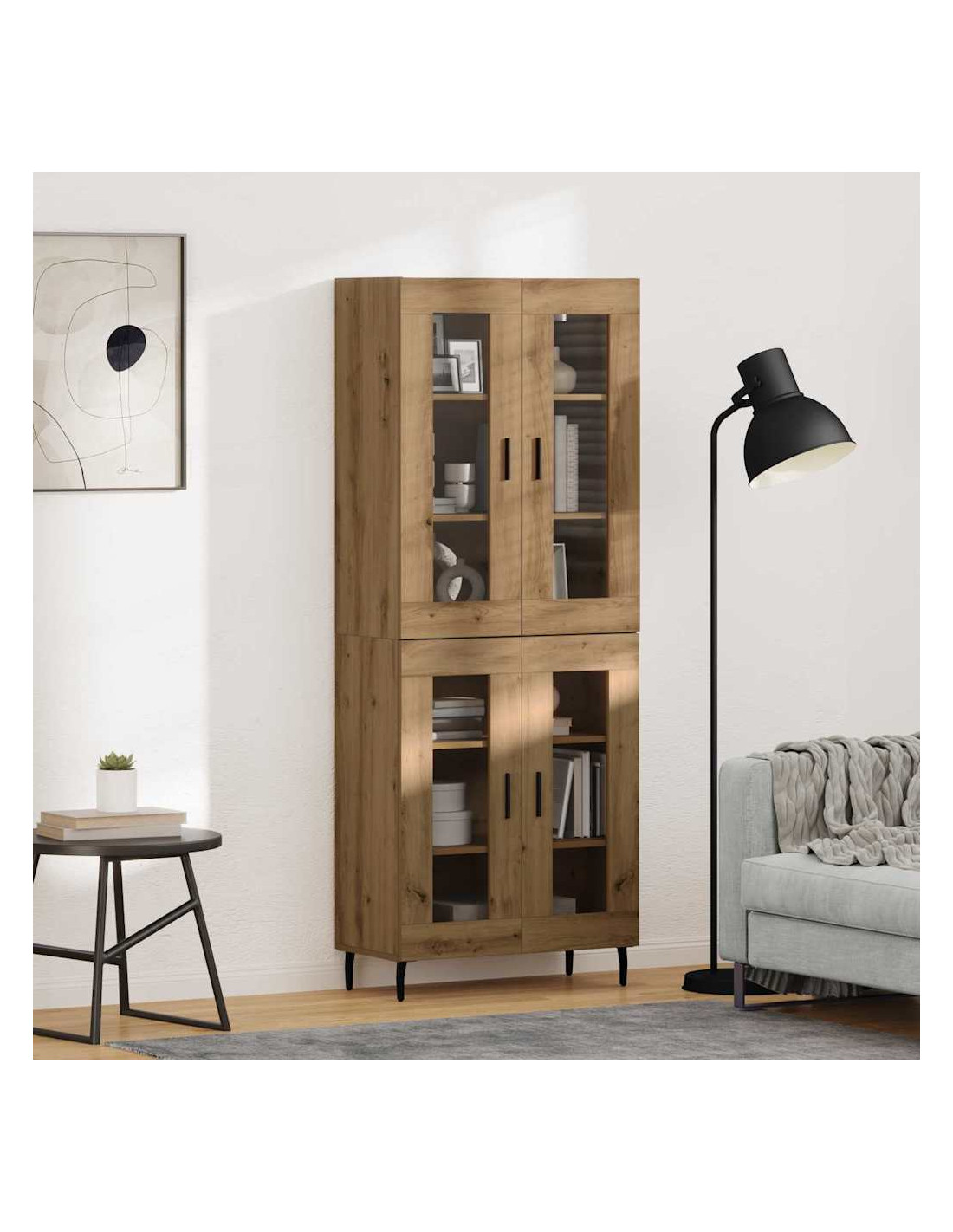- Componenti funzionali: Con gambe in ferro slanciate e maniglie a barra, l'highboard è stabile e facile da usare. Le porte a cerniera e i ripiani organizzano gli oggetti in un modo che è semplice e veloce da accedere.
