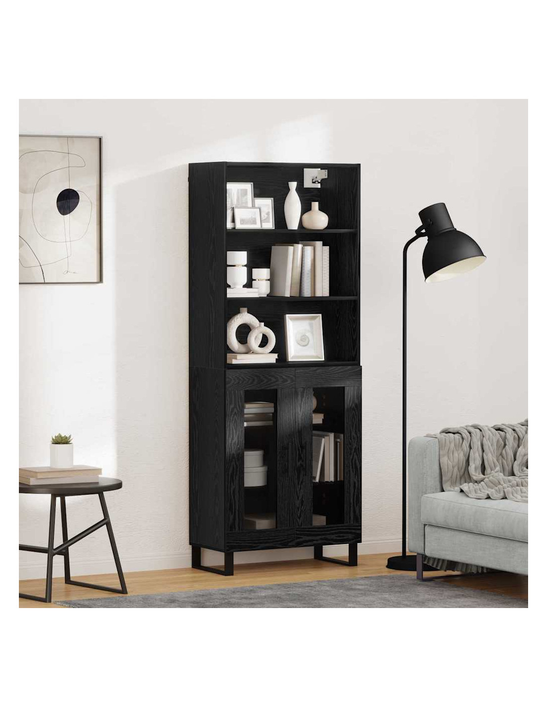 - Piedi moderni e eleganti L'highboard ha robusti piedi in metallo nero con un design a gamba quadrata. Questi piedi non solo aggiungono un tocco moderno, ma forniscono anche stabilità su vari tipi di pavimento.