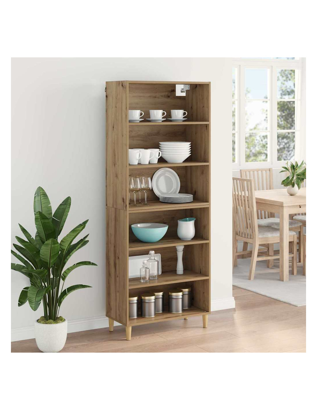 - Design funzionale del retro Il retro finito consente di utilizzare l'highboard anche come divisore per stanze. Questa caratteristica aggiunge flessibilità, migliorando l'utilità nei tuoi spazi abitativi.