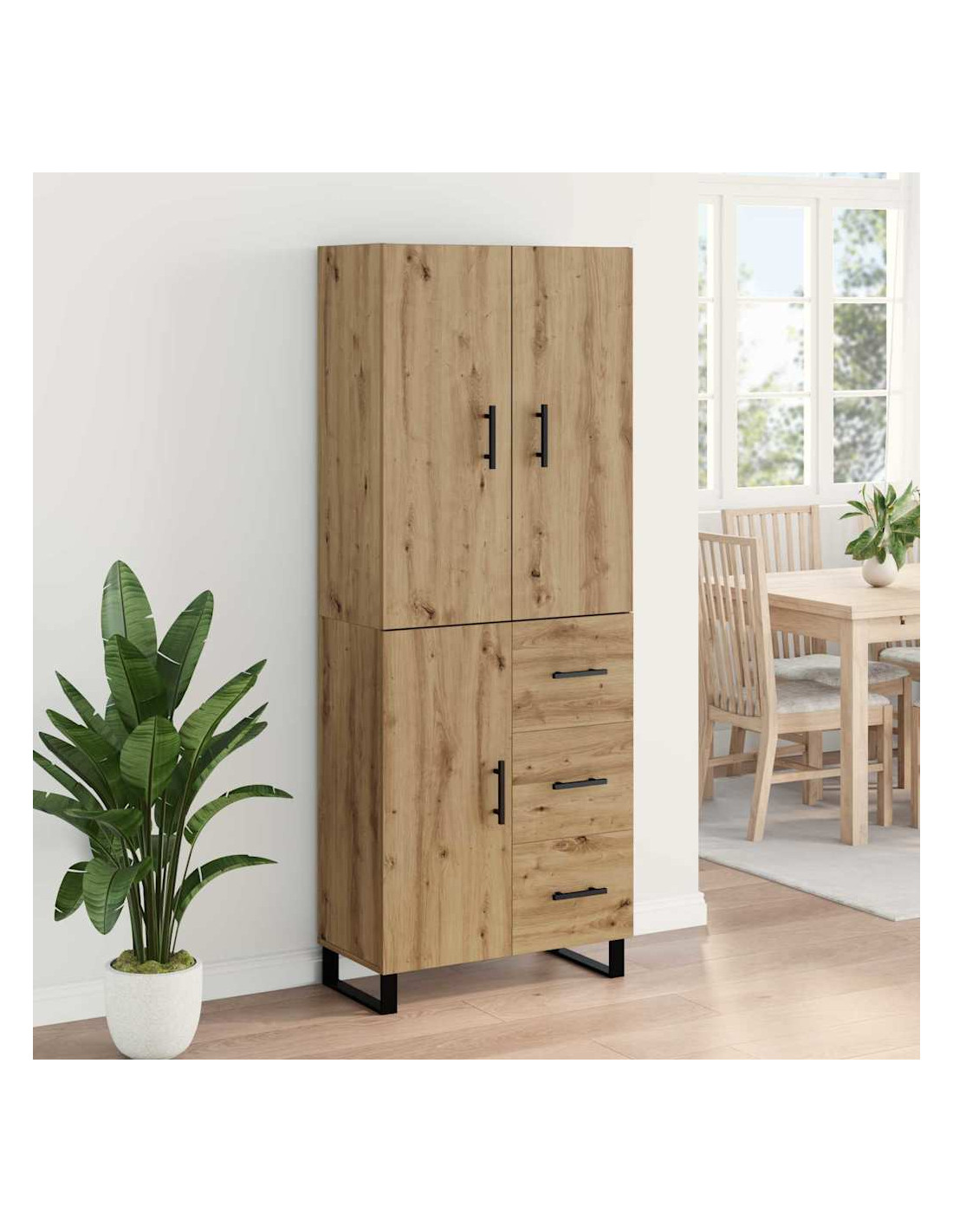 - Legno ingegnerizzato: Questo highboard è realizzato in legno ingegnerizzato, noto per essere resistente e capace di affrontare l'uso quotidiano. La finitura liscia e moderna aggiunge un tocco contemporaneo a qualsiasi stanza. È resistente ai graffi e resta in ottime condizioni anche dopo tanto uso, quindi è perfetto per famiglie impegnate.