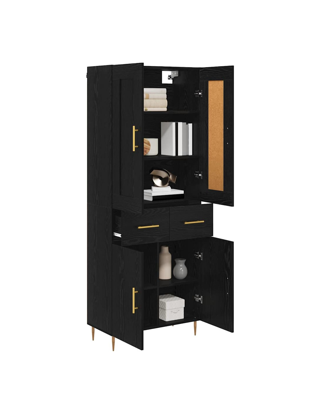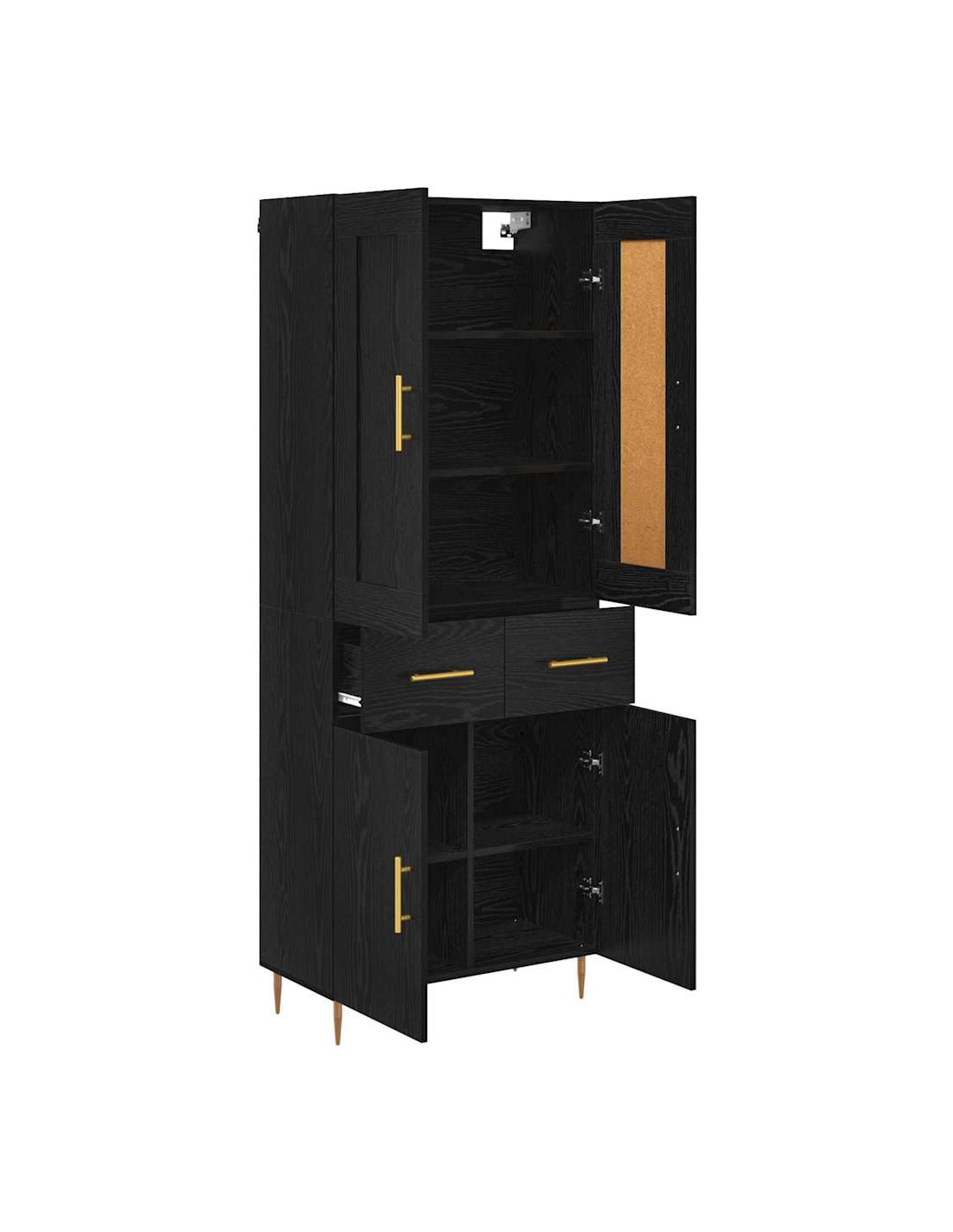 - Accenti dorati e maniglie a barra L'highboard è decorato con accenti dorati e maniglie in metallo che offrono una presa pratico e creano un bel contrasto con il legno. Questa combinazione rende il pezzo ancora più affascinante e moderno.