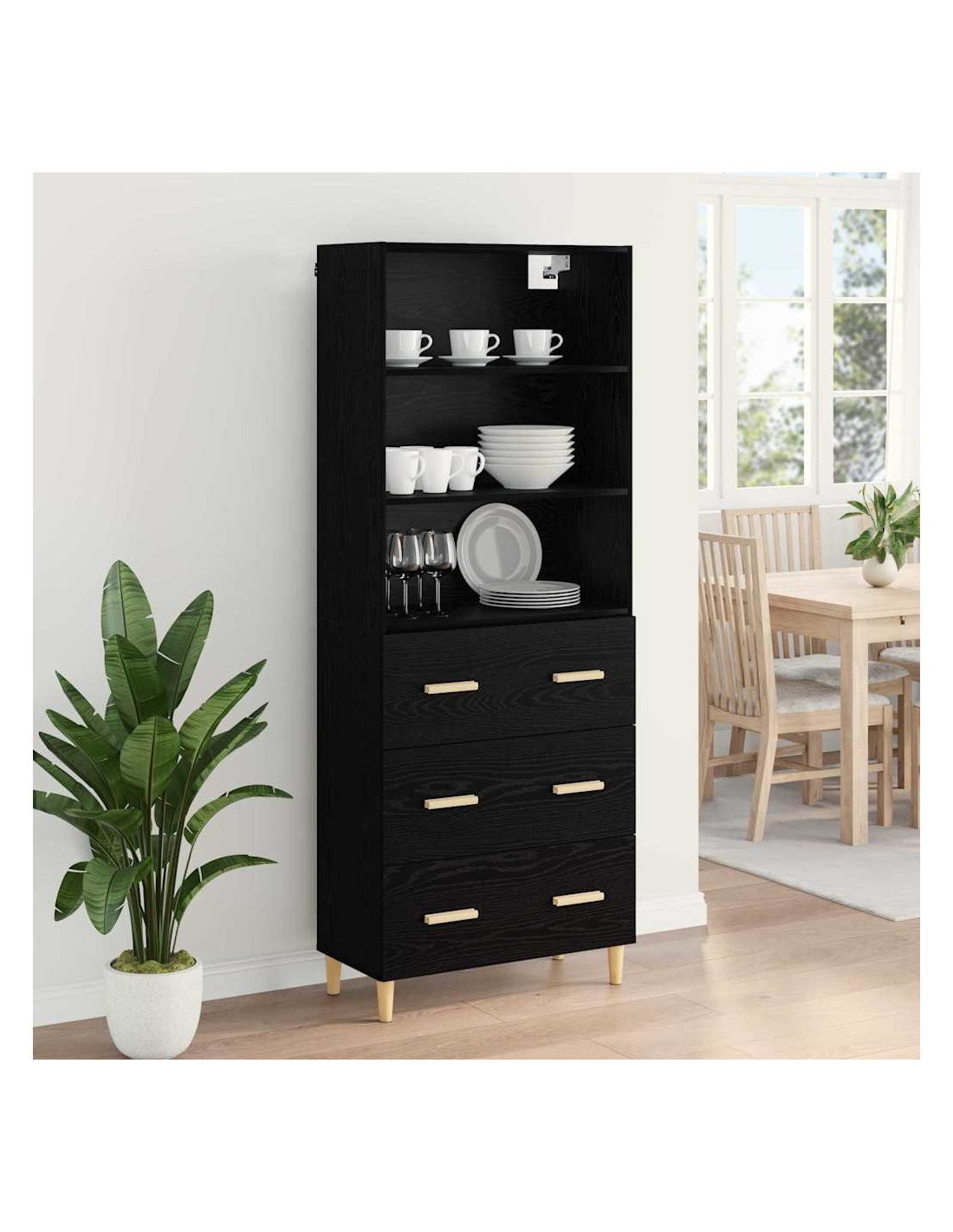 - Materiale in legno ingegnerizzato Realizzato con legno ingegnerizzato di alta qualità, questo highboard è resistente a graffi e usura. La sua durabilità lo rende un elemento imprescindibile nella tua casa per anni, mantenendo fascino e funzionalità.