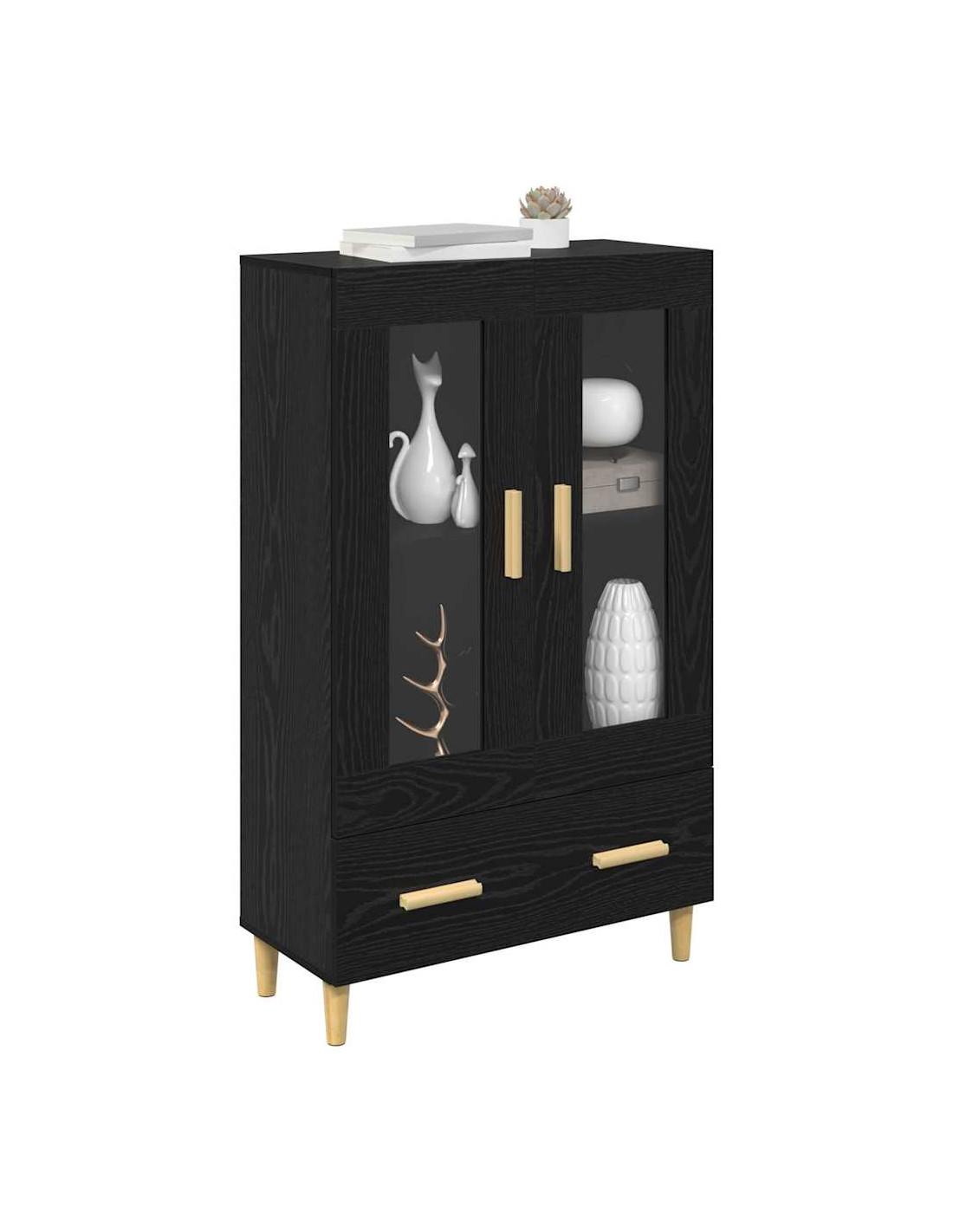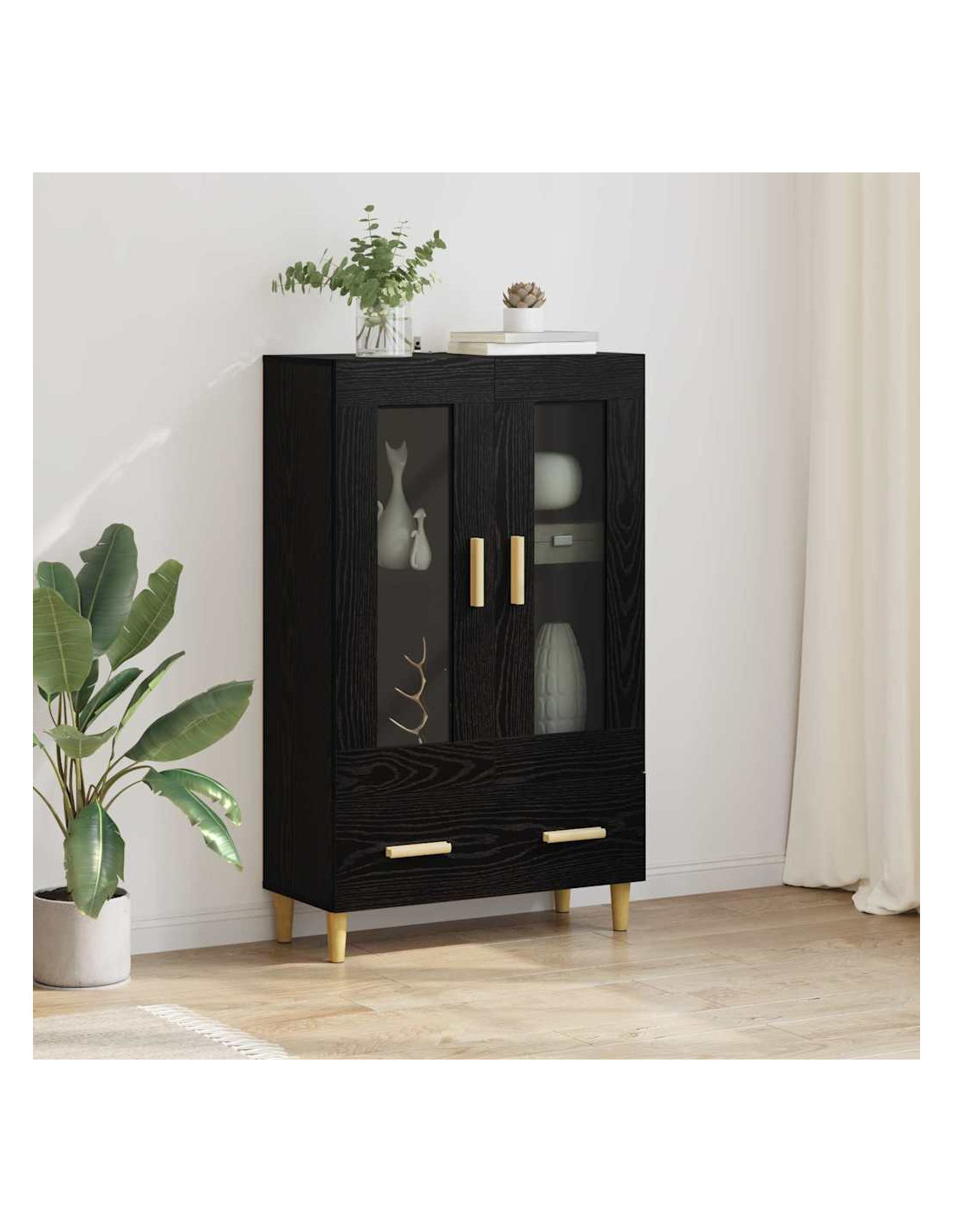 Il Highboard in legno ingegnerizzato unisce stile moderno e funzionalità, rendendolo un'aggiunta chic a qualsiasi soggiorno. Con la sua forma rettangolare elegante, porta un vibe contemporaneo nel tuo spazio, perfetto per tenere in ordine e mettere in mostra i tuoi oggetti preferiti. Le maniglie lucide, le gambe affusolate e le porte in vetro gli danno un tocco di eleganza, mentre il telaio in legno ingegnerizzato assicura stabilità duratura. Che tu lo usi per libri, decorazioni o oggetti di uso quotidiano, questo highboard offre ampio spazio di stoccaggio, integrandosi facilmente nei moderni interni minimalisti.