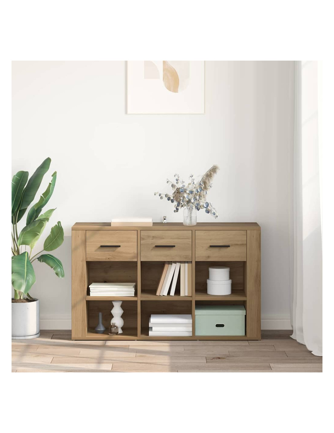 Questa credenza chic unisce il fascino rustico a pratiche soluzioni di archiviazione, diventando un pezzo elegante e versatile per il tuo soggiorno o sala da pranzo. Realizzata in legno ingegnerizzato, la sua superficie testurizzata e i colori naturali si abbinano perfettamente a qualsiasi tipo di arredamento, offrendo tanto spazio per riporre o esporre quello che ti serve.