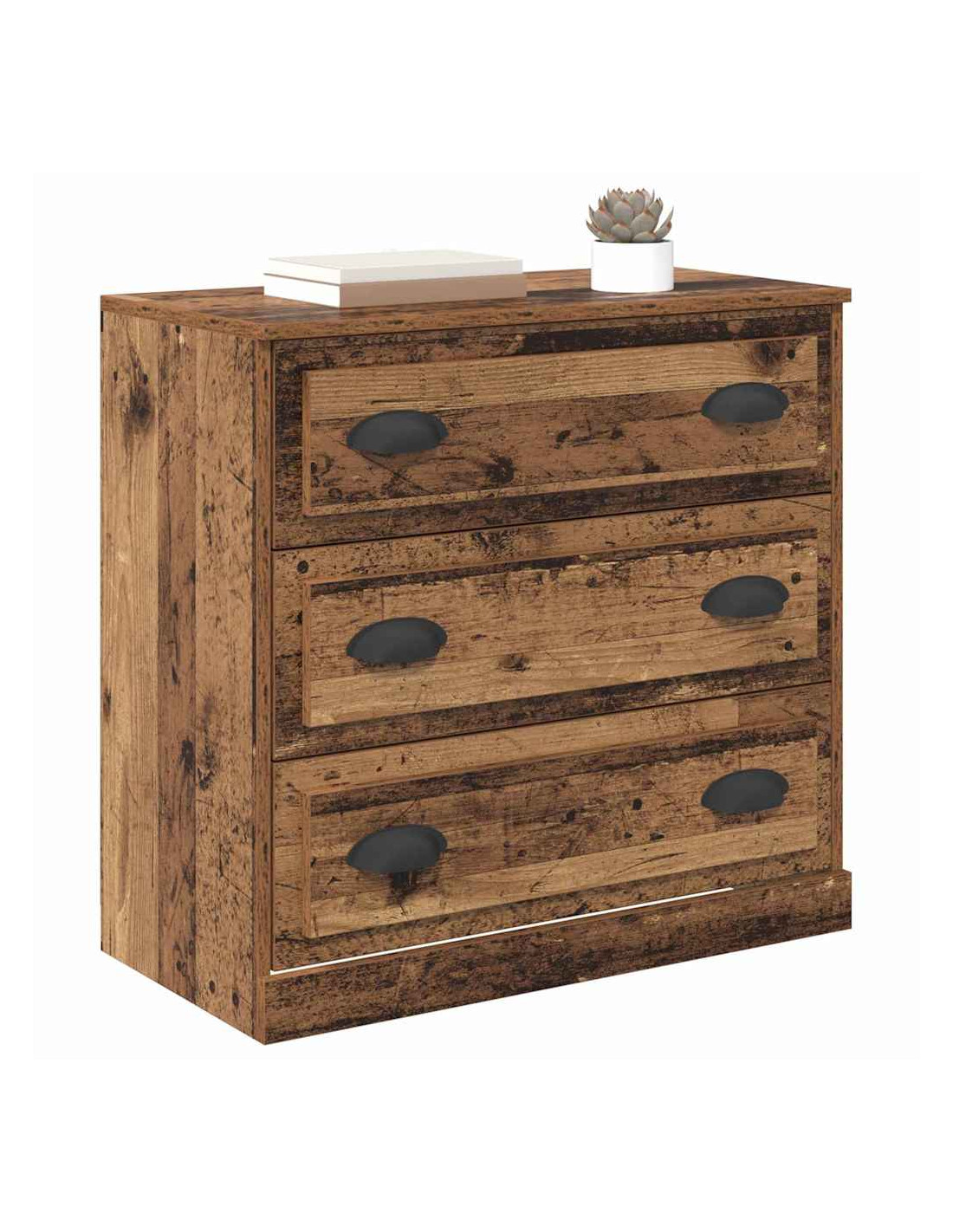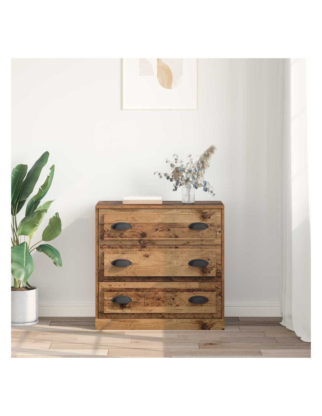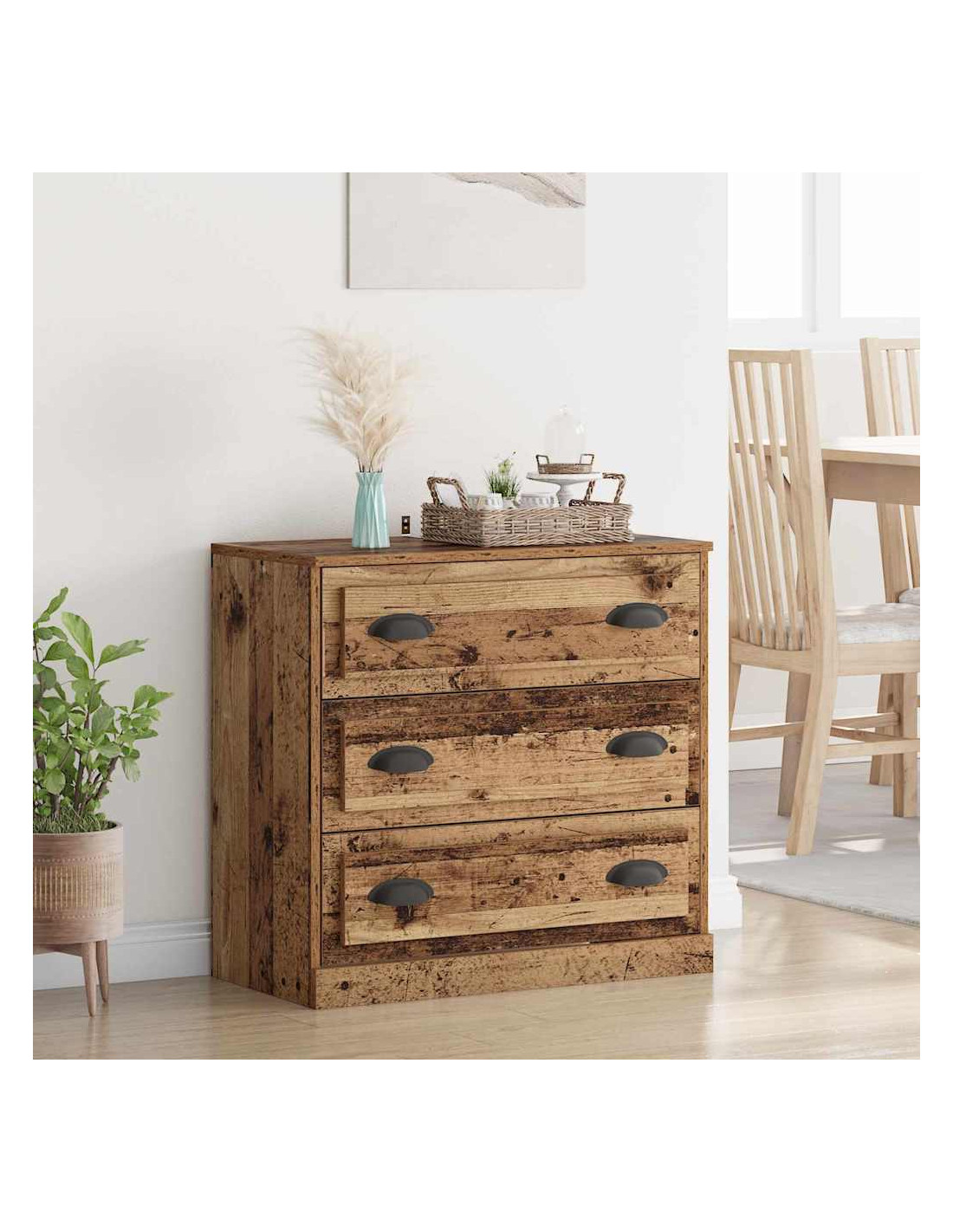Questa credenza è un'unità rettangolare che combina perfettamente stile e praticità. Il design moderno porta un tocco rustico in soggiorni o sale da pranzo e si presta a vari usi. Grazie alle maniglie a D, i cassetti si aprono facilmente. Crea un'atmosfera calda e accogliente ovunque la metti. È pensata per interni e si adatta bene a qualsiasi decorazione, che sia moderna o tradizionale.