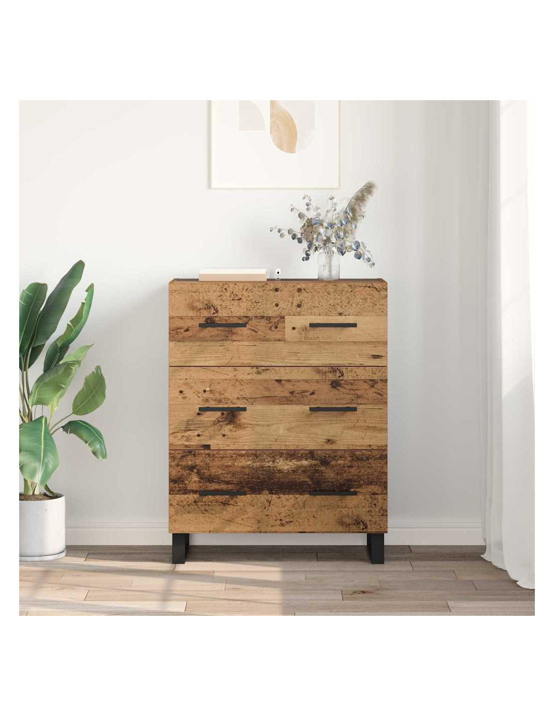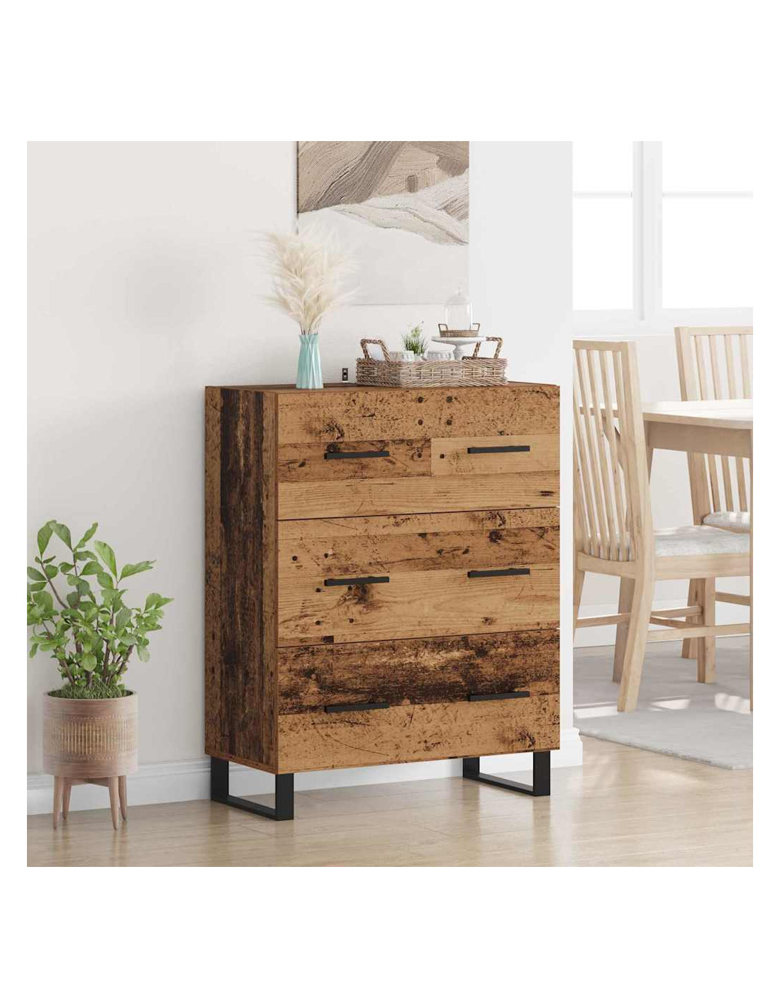 - Materiali: Fatto interamente in legno ingegnerizzato, la credenza ha una struttura robusta che unisce calore e resistenza. Questo materiale garantisce non solo durata, ma contribuisce anche al fascino rustico del pezzo, mantenendo un aspetto invitante mentre offre soluzioni di stoccaggio sicure.