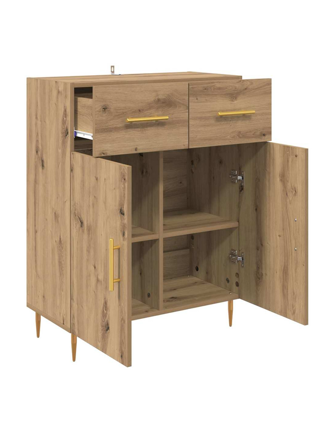 - Componenti Inclusi: Questa unità di stoccaggio ha diversi ripiani, cassetti e porte in legno ingegnerizzato, offrendo diverse opzioni per l’organizzazione. Questi elementi sono facili da raggiungere, migliorando la funzionalità della credenza oltre l’aspetto estetico.