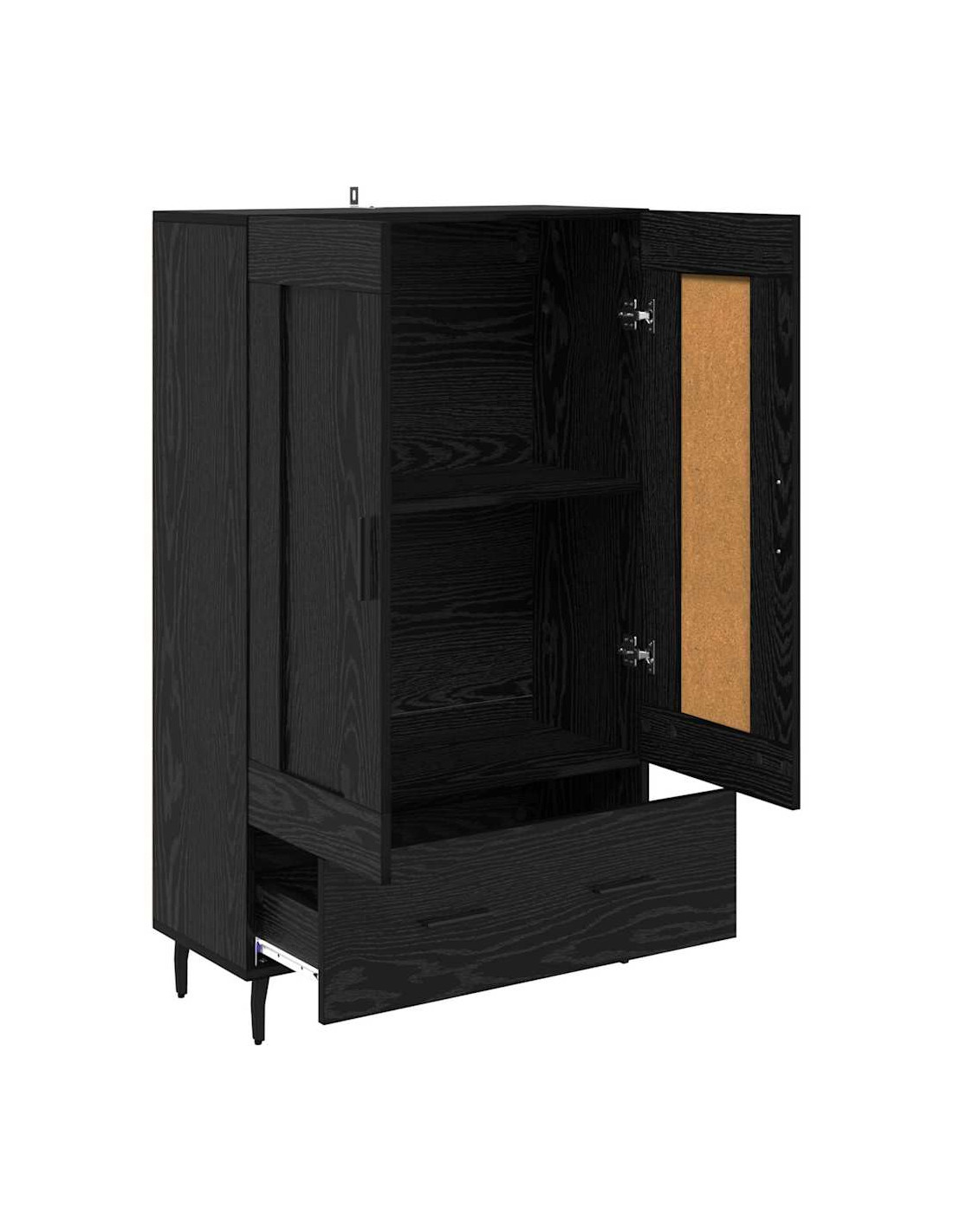 - Maniglie e piedi in metallo: Con maniglie a barra in metallo e piedi affusolati, l'armadietto ha un aspetto moderno e chic. La finitura nera opaca si sposa perfettamente con il design, unendo praticità ed estetica contemporanea per un look di classe.