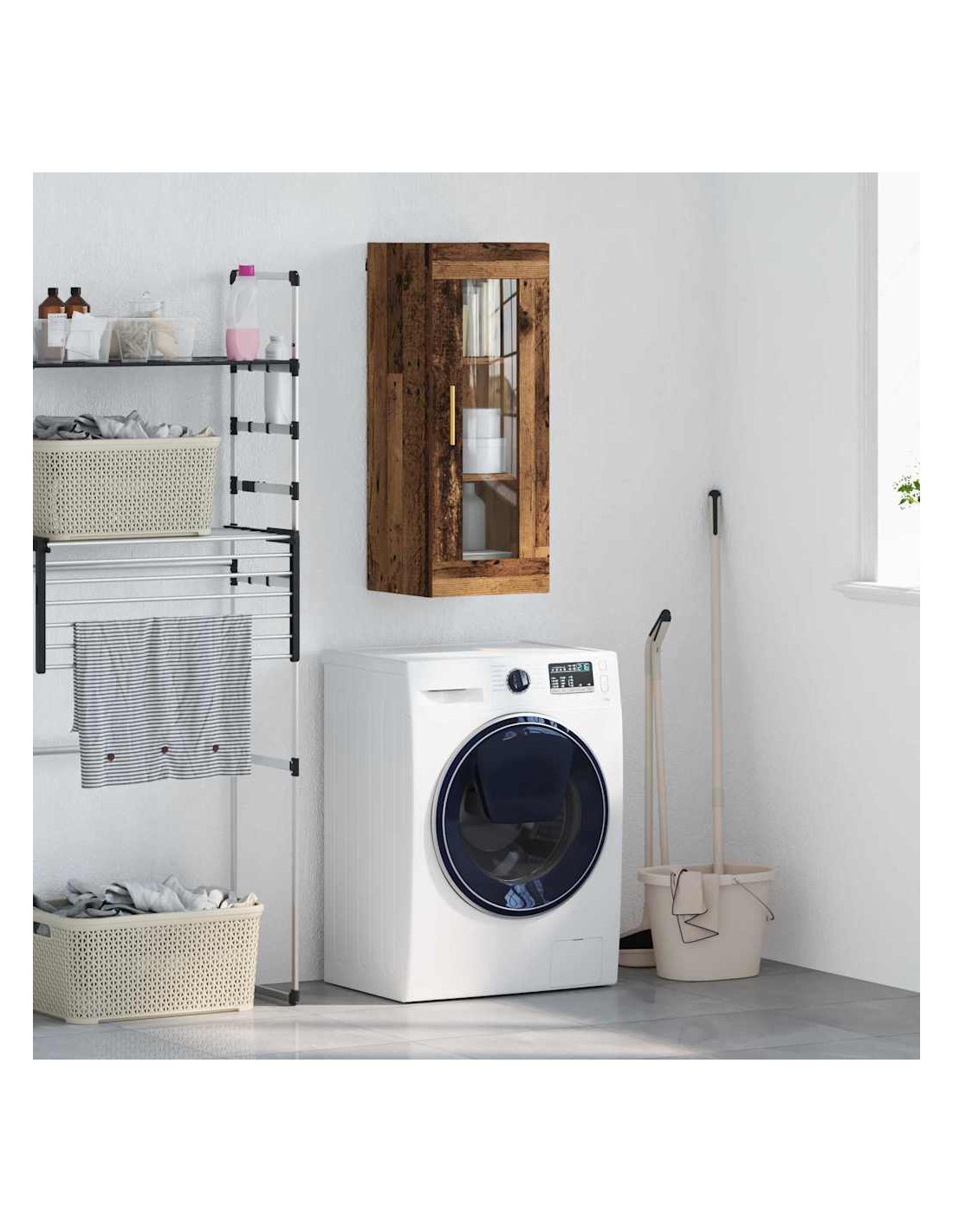 - Materiali: Costruito in legno ingegnerizzato e vetro, l'armadietto è bello e resistente. Il legno è robusto, assicurando solidità, mentre il vetro aggiunge un tocco elegante, mostrando cosa c'è dentro.