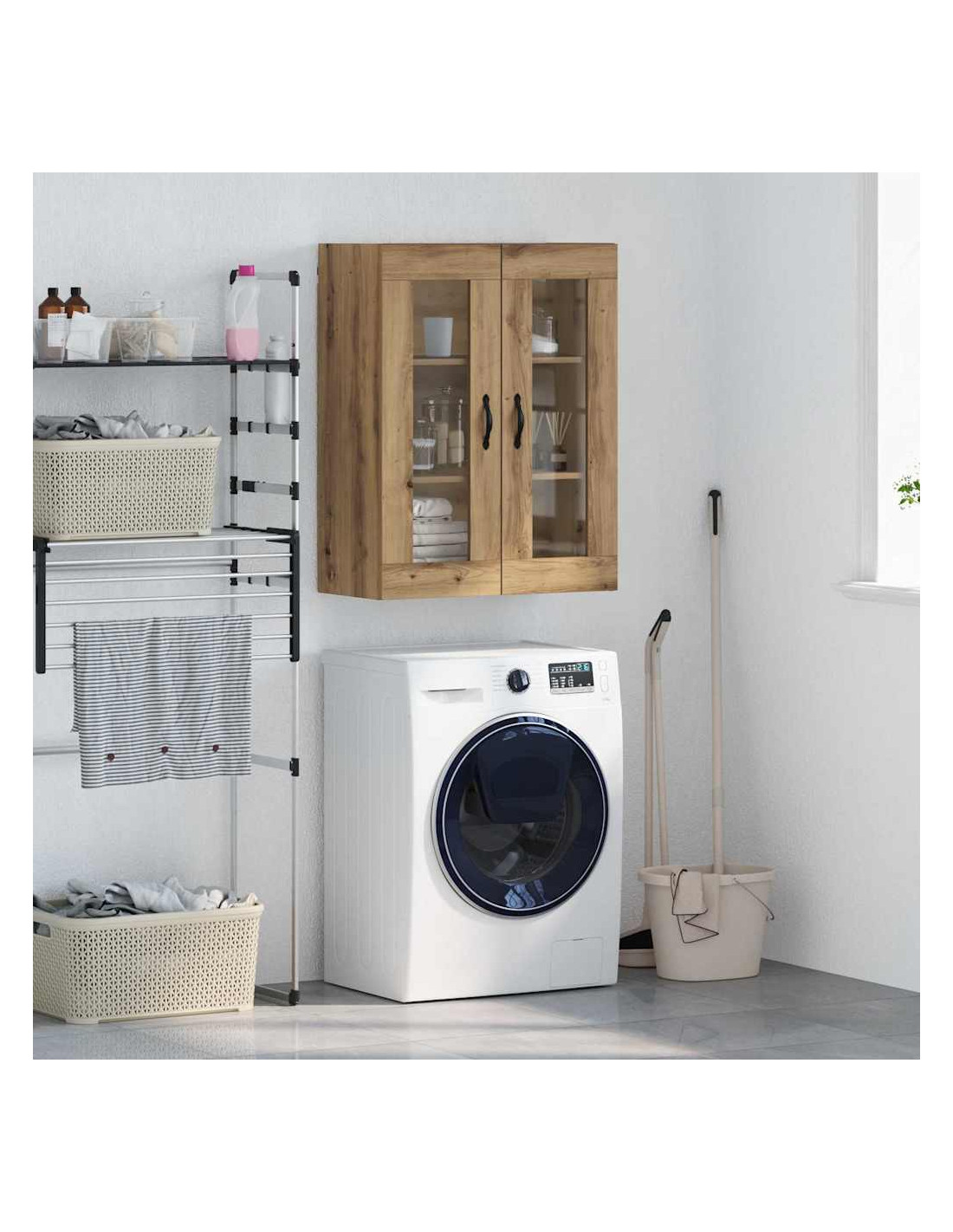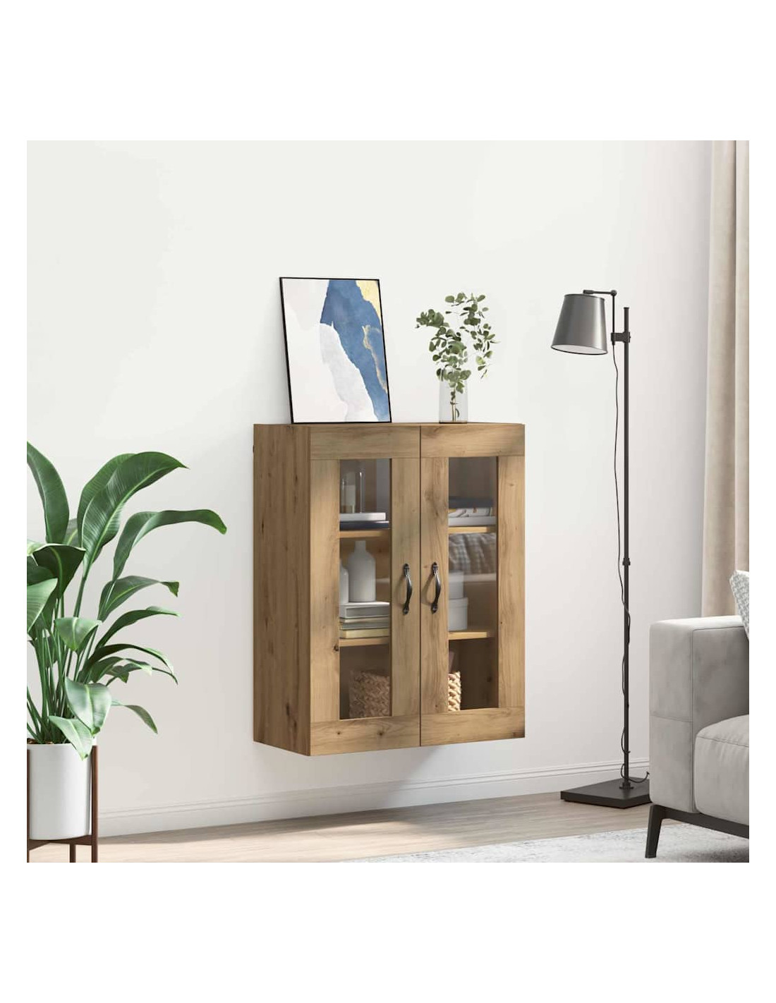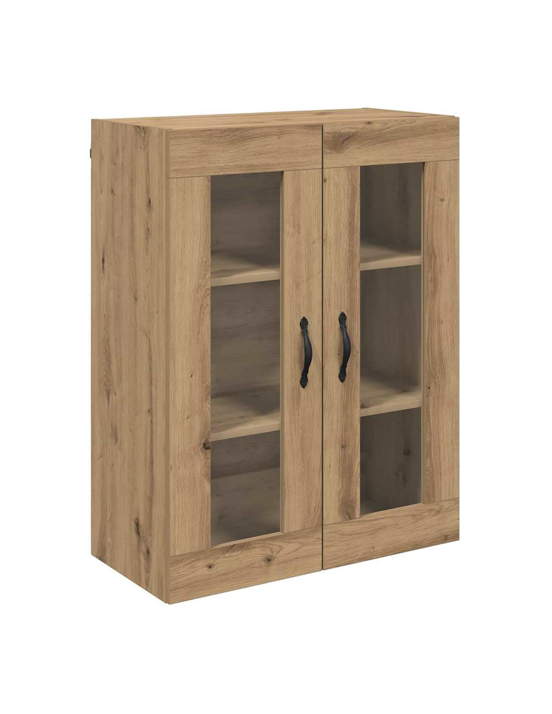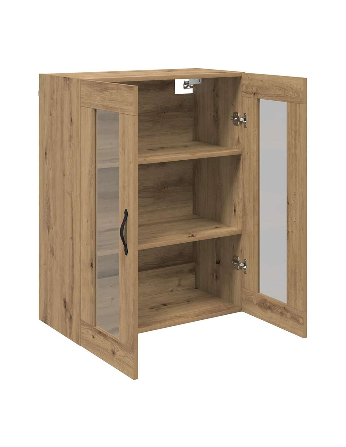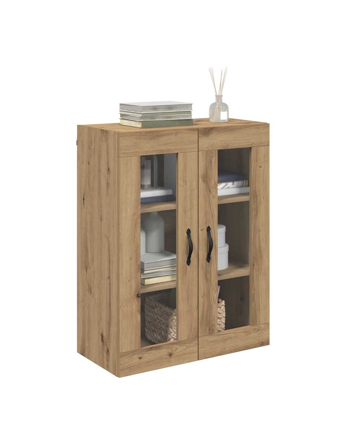 - Componenti inclusi: È dotato di una maniglia in metallo elegante per una facile apertura, ed è accompagnato da mensole a parete in legno ingegnerizzato che aumentano lo spazio disponibile. Le porte in vetro offrono un aspetto raffinato e permettono di mostrare gli oggetti dentro.