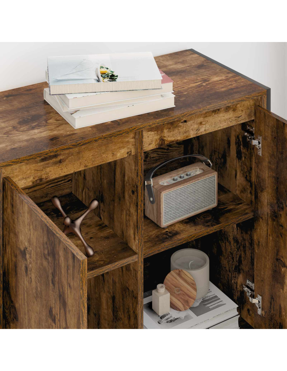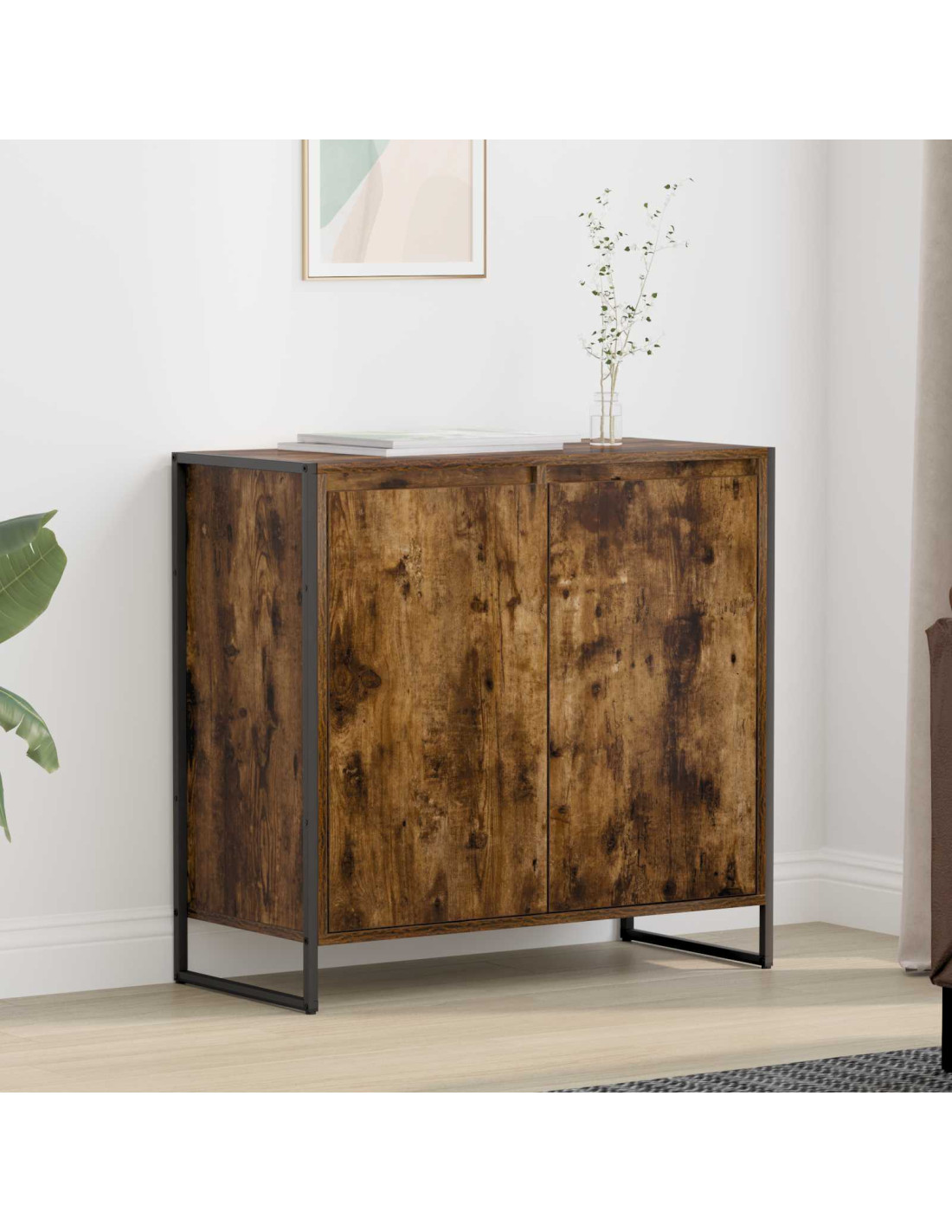 - Design Industriale: Questo armadietto laterale unisce splendidi dettagli rustici a linee moderne, creando un pezzo unico che si integra in vari stili d'interni. Il contrasto tra la superficie in legno ingegnerizzato e i piedi in acciaio lucido è un perfetto mix di calore e modernità, rendendolo un'aggiunta interessante al tuo soggiorno.