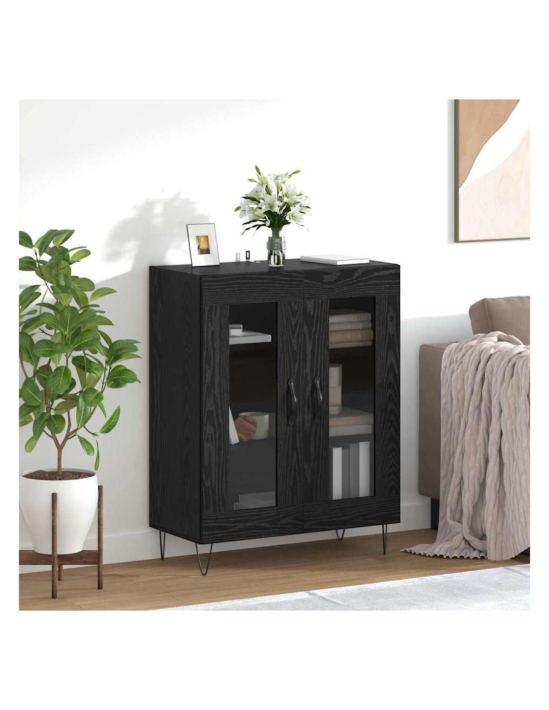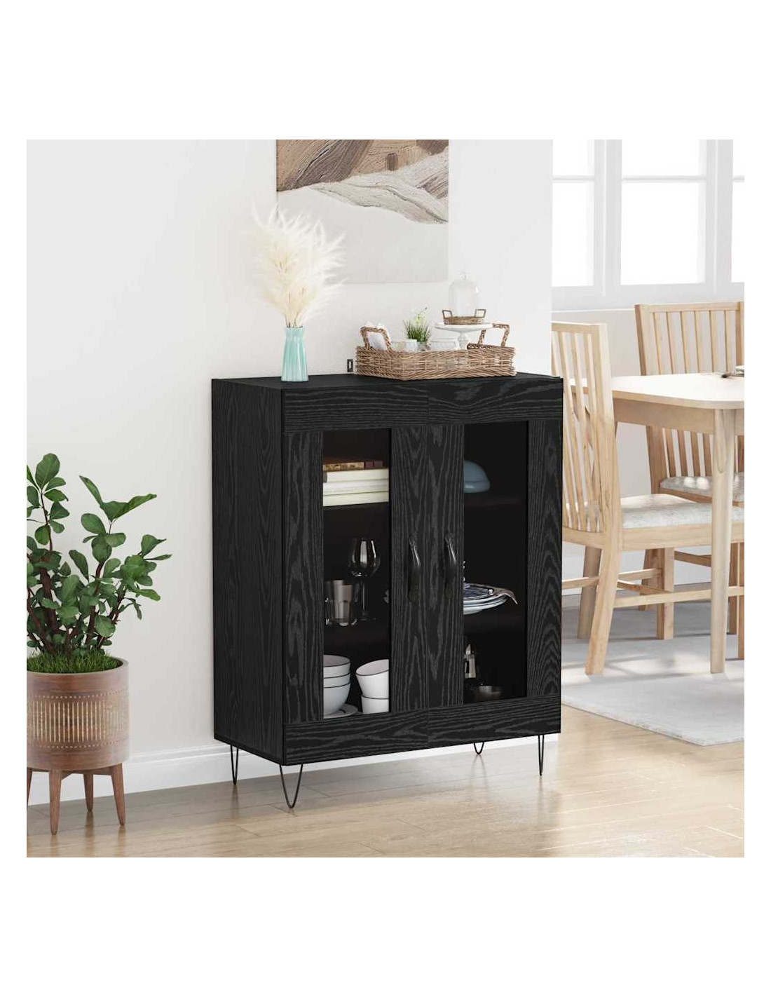 - Costruzione in legno ingegnerizzato: Questo sideboard è fatto di legno ingegnerizzato, noto per la sua robustezza e superficie liscia. Questa struttura offre stabilità e un aspetto chic, assicurando una lunga durata nel tuo soggiorno.