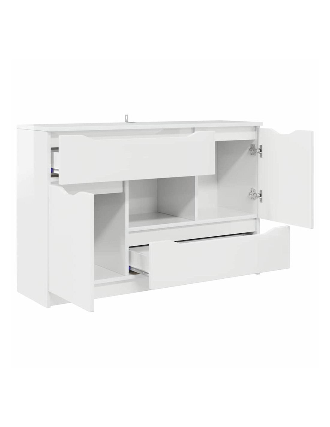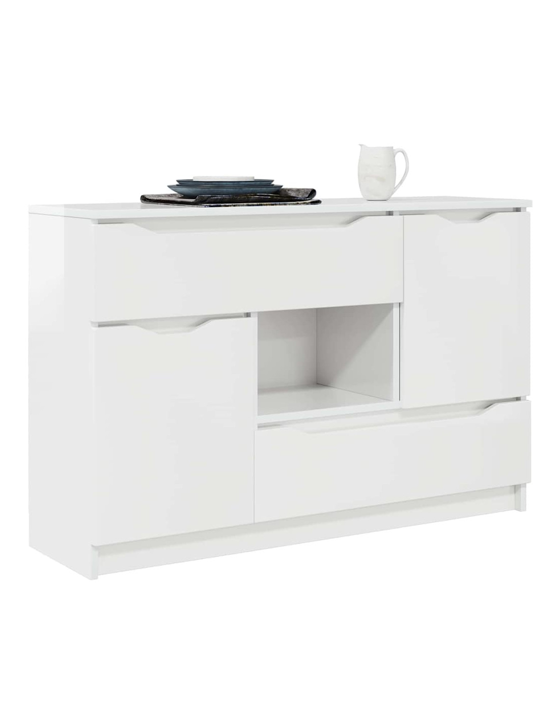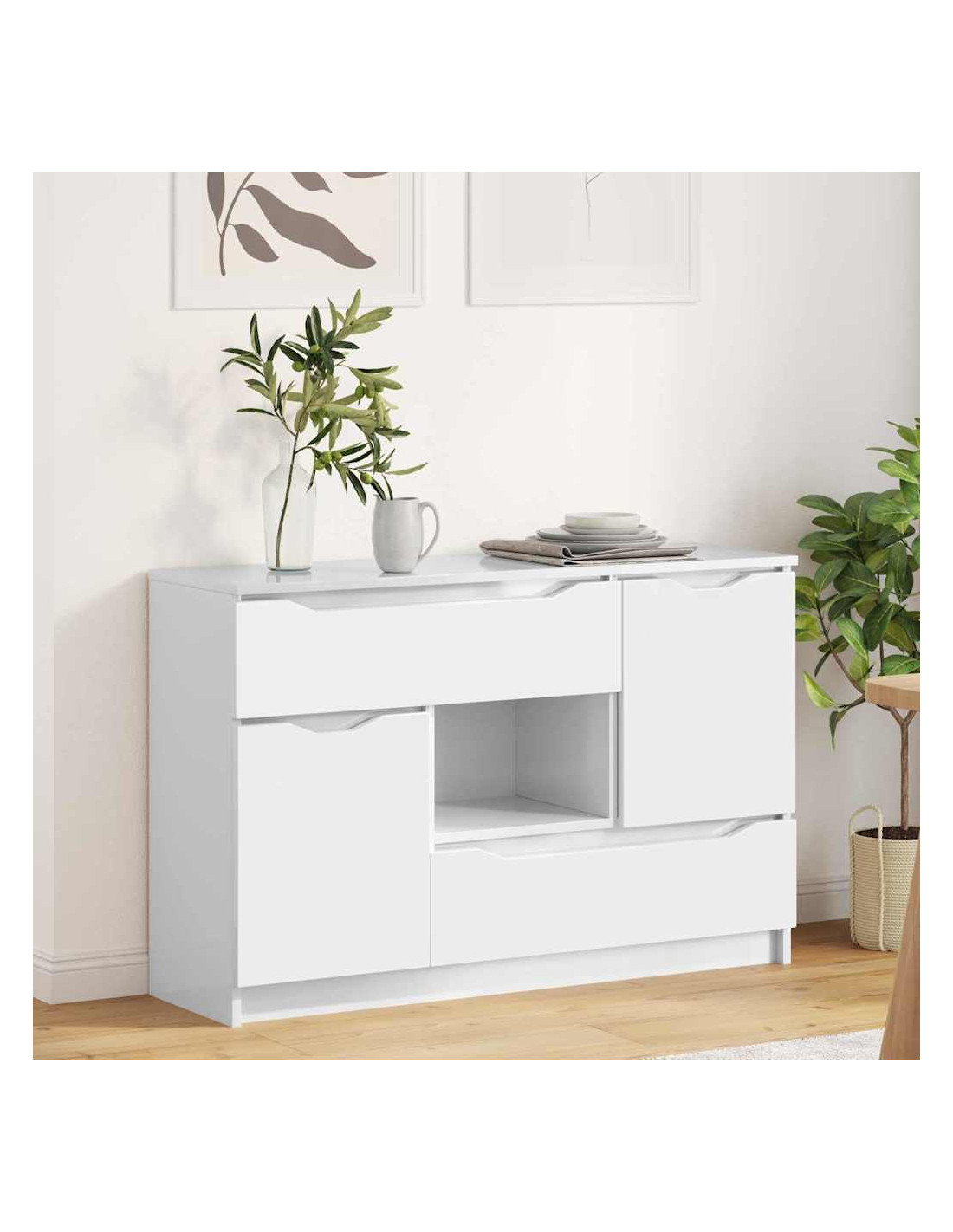 - Componenti funzionali: Con guide a sfera per i cassetti, la credenza consente un'apertura fluida, mentre le porte a cerniera permettono un facile accesso agli spazi interni. Con un retro in legno ingegnerizzato, mantiene la sua struttura solida. Questi elementi sono pensati per rendere l'uso della credenza pratico, permettendo di organizzare senza rinunciare allo stile.