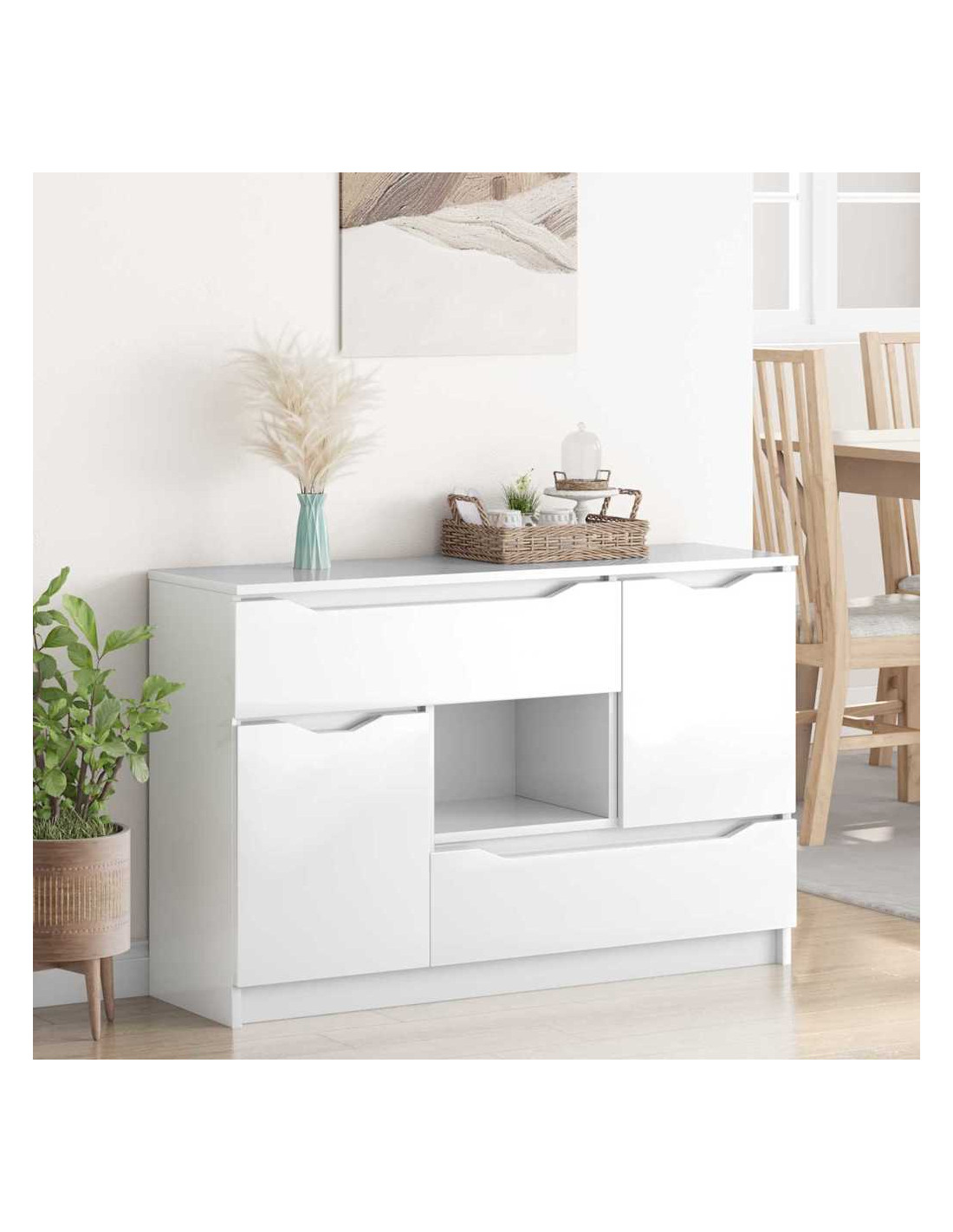 - Design moderno: Il design moderno della credenza si nota nelle sue linee pulite e nel suo approccio minimalista. Questa semplicità enfatizza la sua funzione, facendola integrarsi bene con vari stili di decorazione. Un pezzo versatile che migliora l'aspetto del tuo soggiorno mentre offre pratico spazio di stoccaggio.