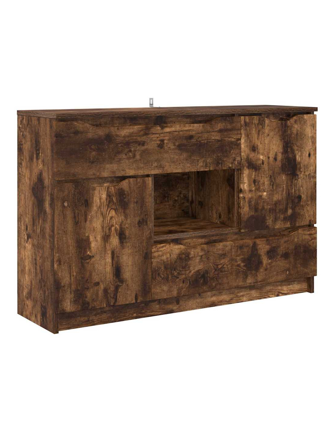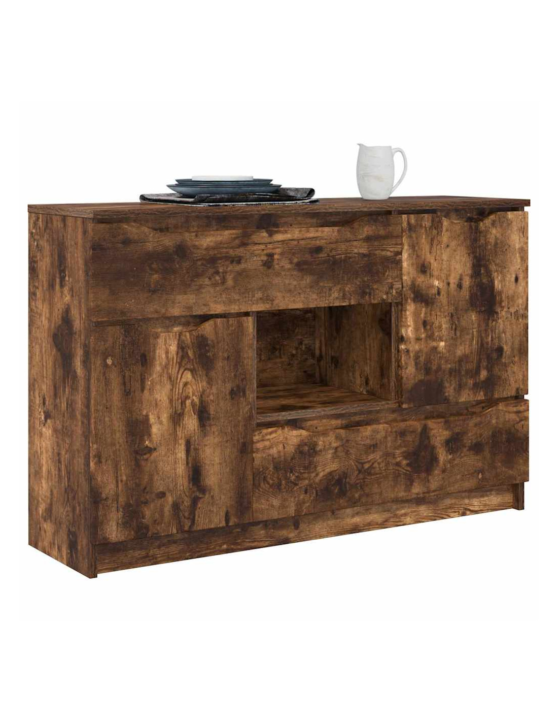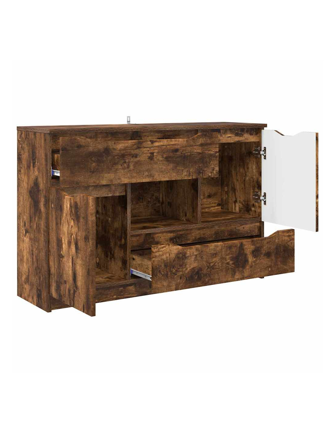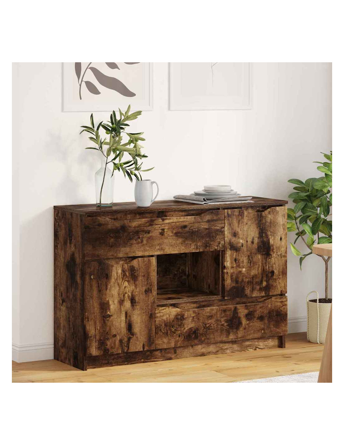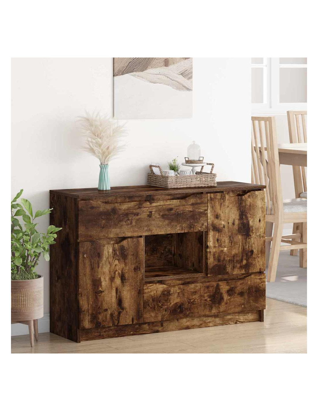 - Componenti funzionali: Con guide a sfera per i cassetti, la credenza consente un'apertura fluida, mentre le porte a cerniera permettono un facile accesso agli spazi interni. Con un retro in legno ingegnerizzato, mantiene la sua struttura solida. Questi elementi sono pensati per rendere l'uso della credenza pratico, permettendo di organizzare senza rinunciare allo stile.
