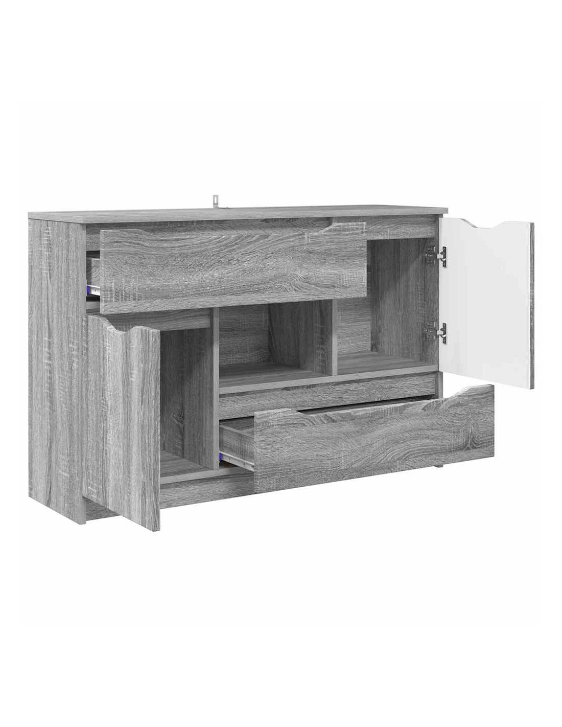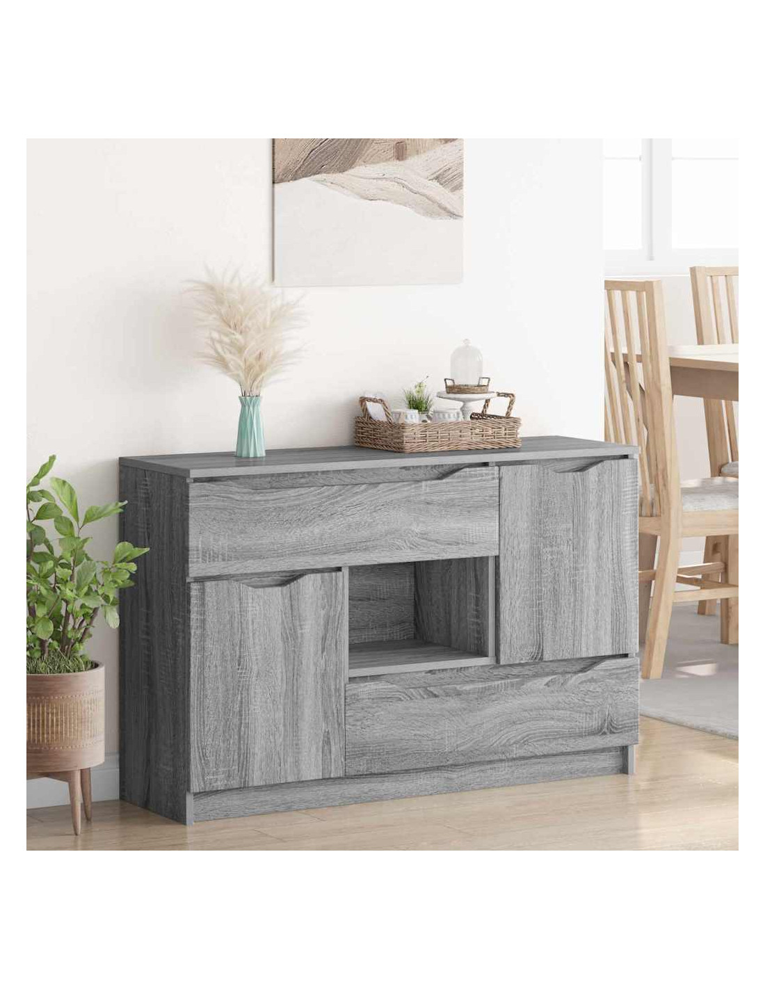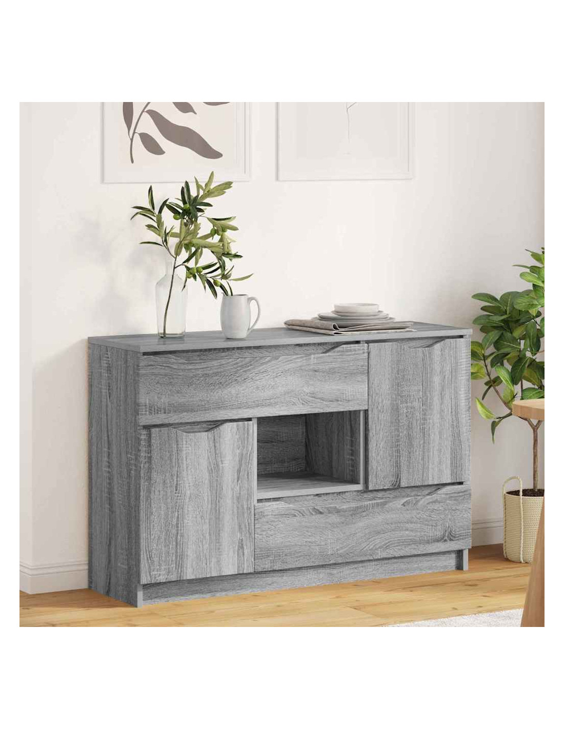 - Componenti funzionali: Con guide a sfera per i cassetti, la credenza consente un'apertura fluida, mentre le porte a cerniera permettono un facile accesso agli spazi interni. Con un retro in legno ingegnerizzato, mantiene la sua struttura solida. Questi elementi sono pensati per rendere l'uso della credenza pratico, permettendo di organizzare senza rinunciare allo stile.