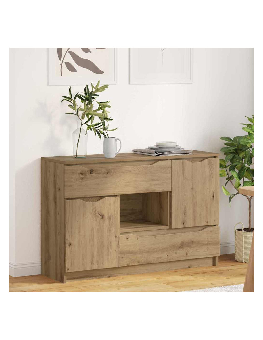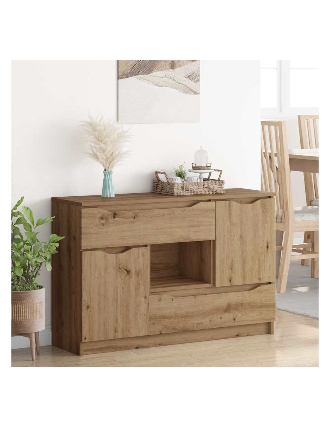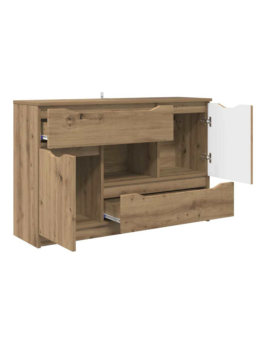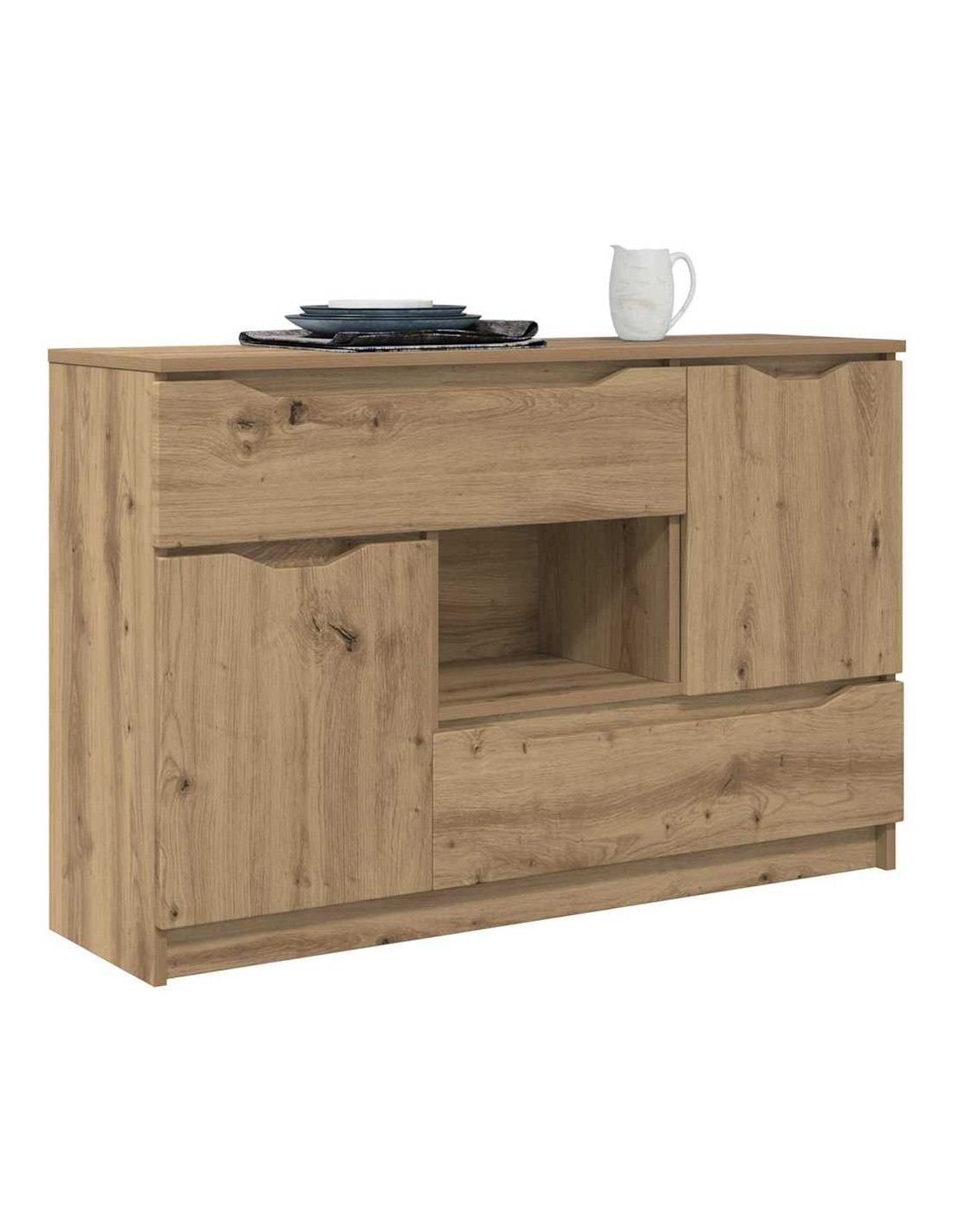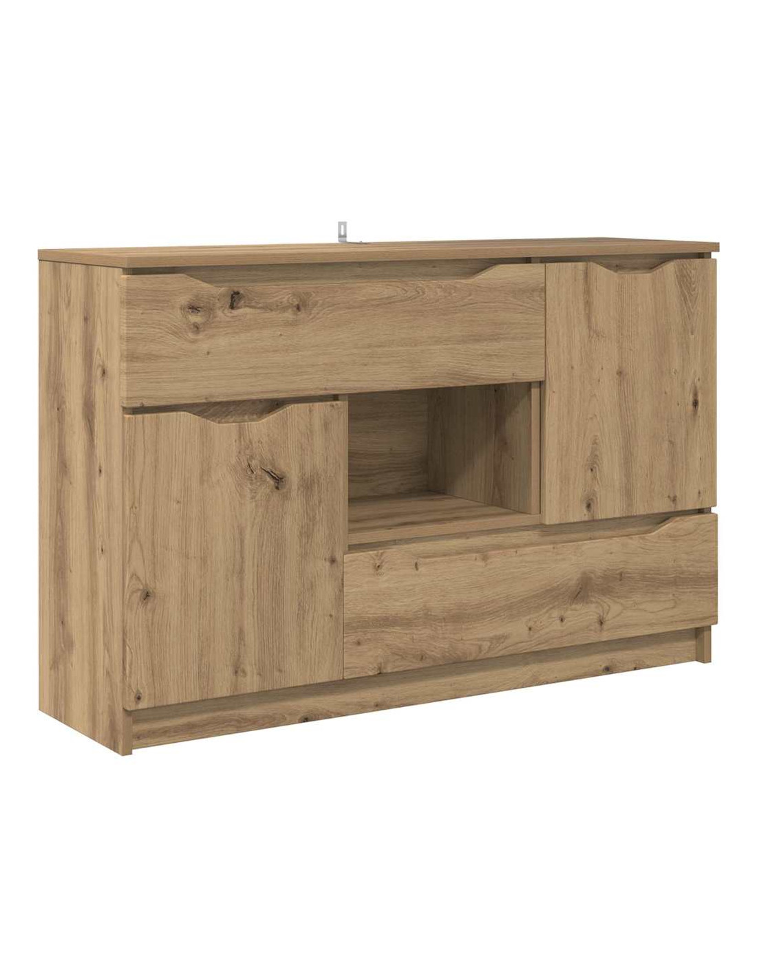 - Componenti funzionali: Con guide a sfera per i cassetti, la credenza consente un'apertura fluida, mentre le porte a cerniera permettono un facile accesso agli spazi interni. Con un retro in legno ingegnerizzato, mantiene la sua struttura solida. Questi elementi sono pensati per rendere l'uso della credenza pratico, permettendo di organizzare senza rinunciare allo stile.