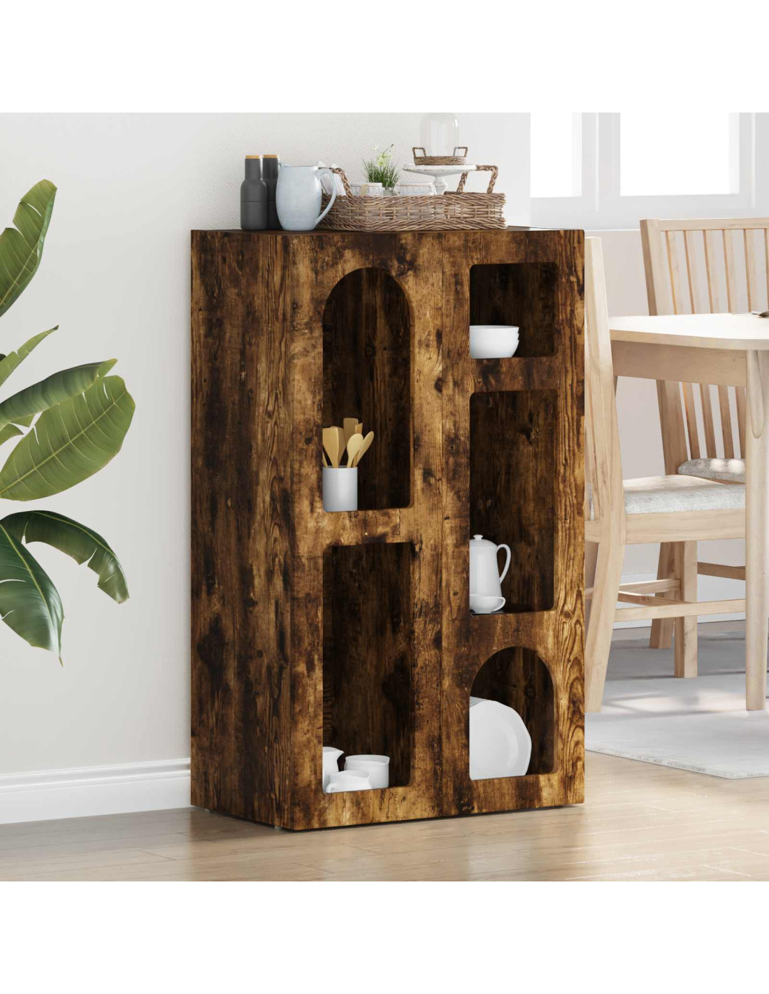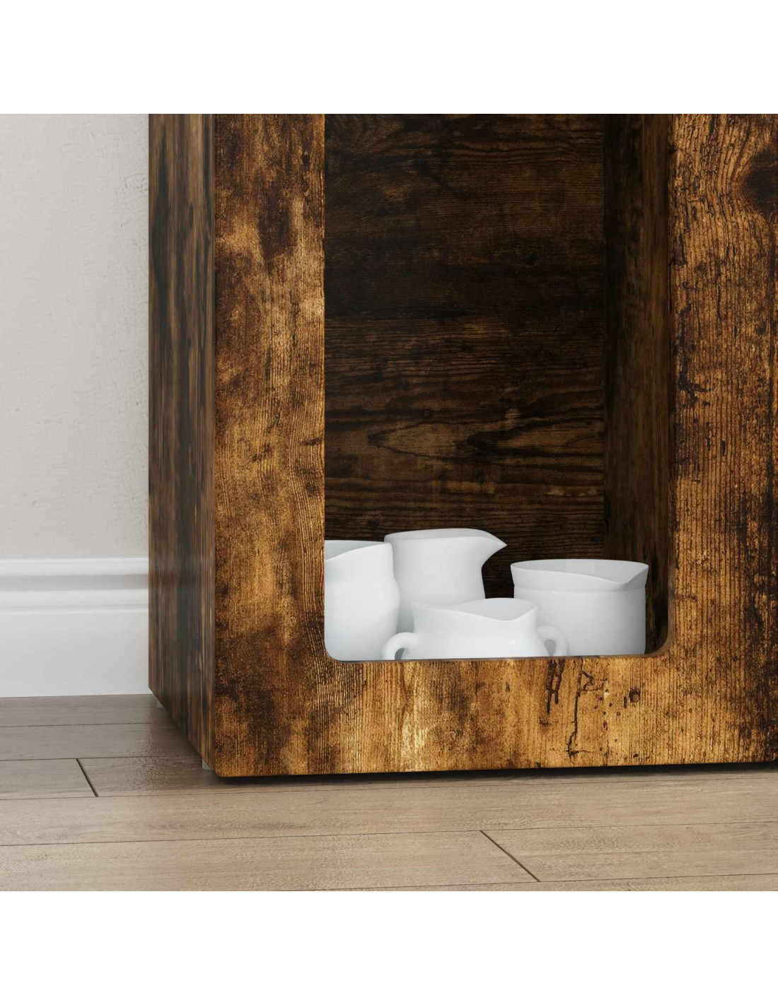 - Materiali: Questa credenza è tutta in legno ingegnerizzato, garantendo solidità e affidabilità. Questo materiale, noto per la sua durezza, è usato per il telaio, il retro, la superficie e i ripiani, assicurando un look elegante e duraturo che si integra perfettamente negli interni moderni.