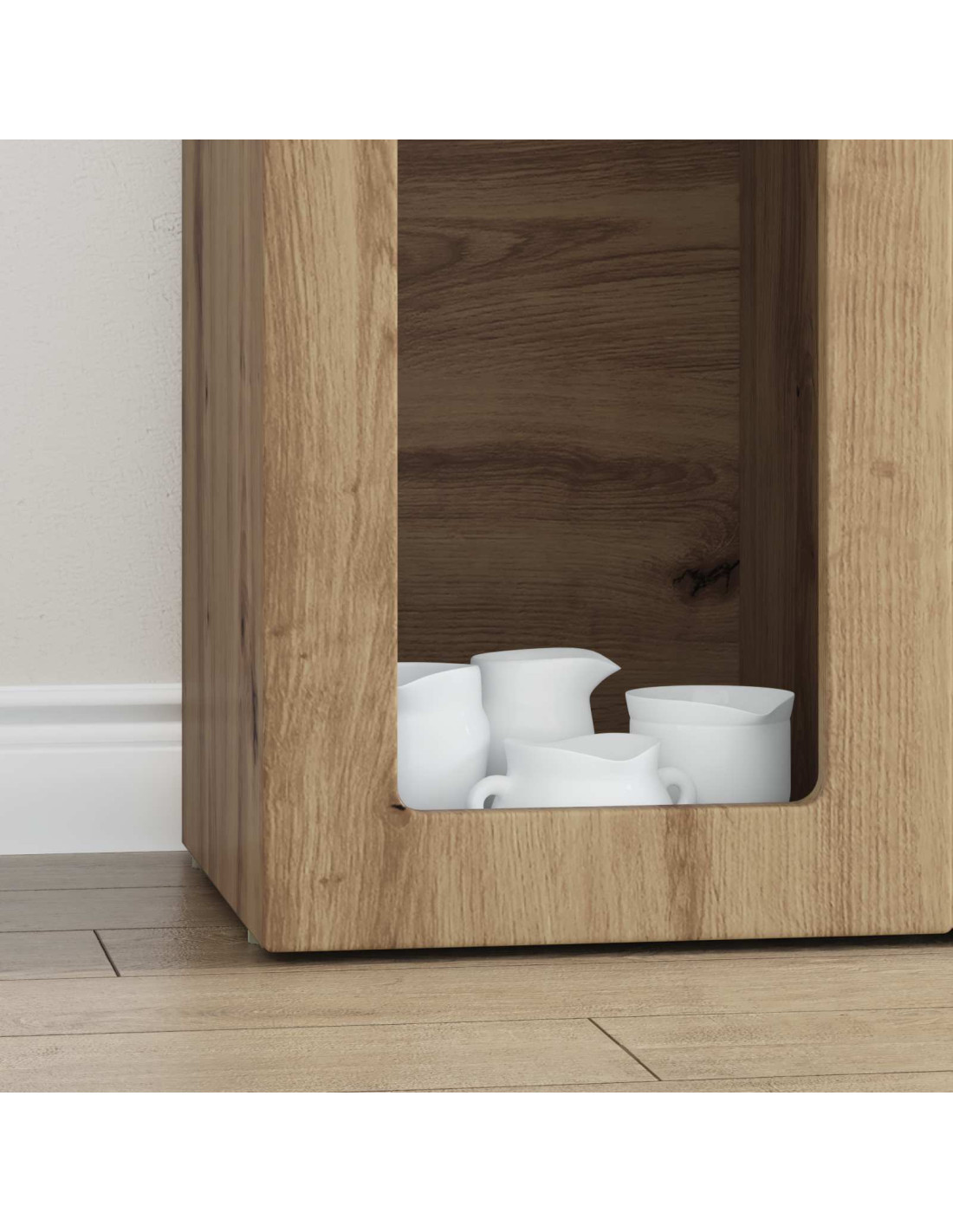 - Materiali: Questa credenza è tutta in legno ingegnerizzato, garantendo solidità e affidabilità. Questo materiale, noto per la sua durezza, è usato per il telaio, il retro, la superficie e i ripiani, assicurando un look elegante e duraturo che si integra perfettamente negli interni moderni.