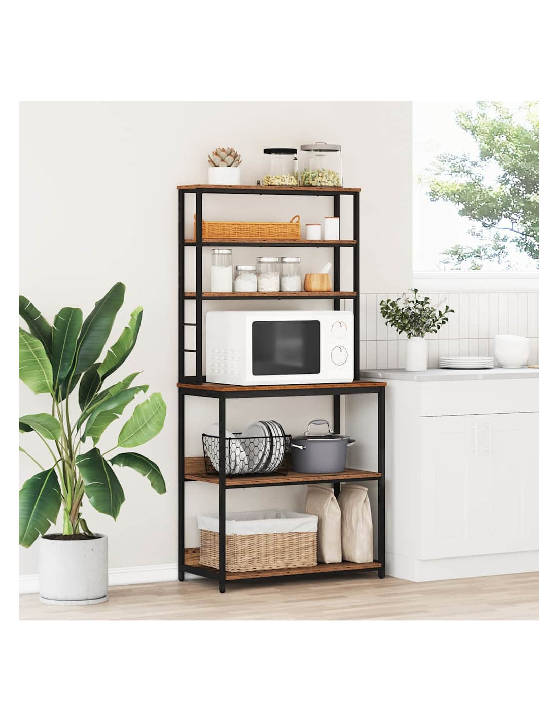 Lo scaffale da cucina industriale è una soluzione di stoccaggio versatile che rende le cucine, le dispense e le sale da pranzo più interessanti. Con il suo robusto telaio in acciaio e i ripiani in legno ingegnerizzato, incarna il fascino dello stile industriale, rispondendo alle esigenze pratiche delle case moderne. Questa unità rettangolare è perfetta per chi cerca unire forma e funzione, offrendo tanto spazio per tutto, dagli utensili da cucina a elementi decorativi. Il design si integra bene in loft e spazi ispirati all'industriale.