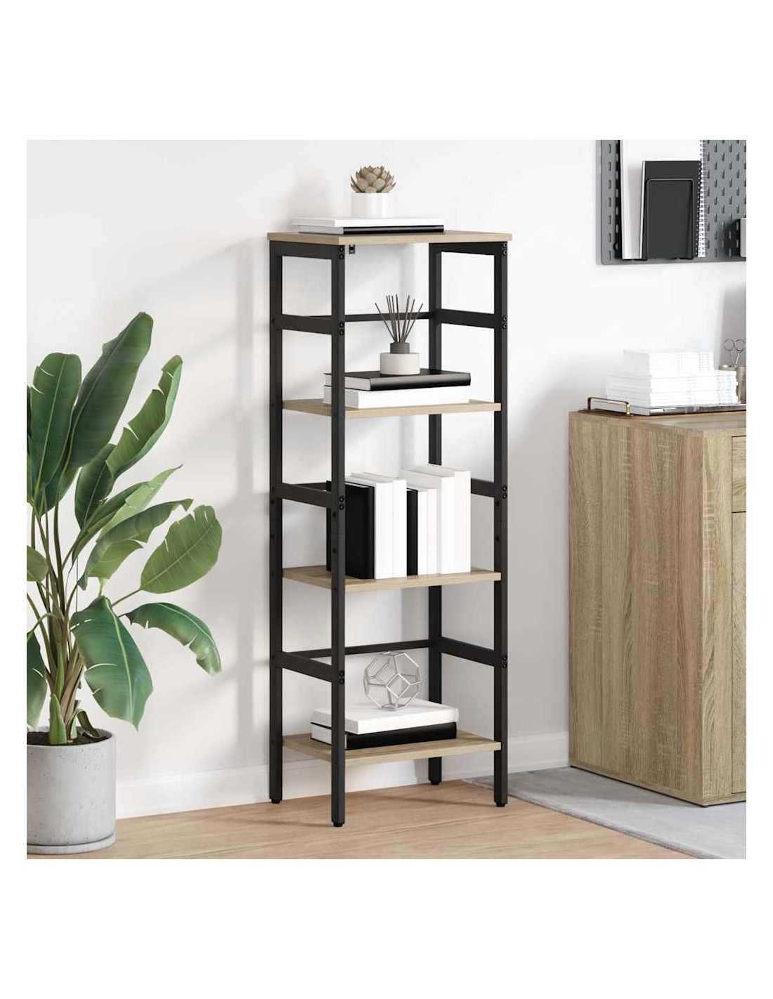 Questa libreria industriale è una vera chicca per chi ama il design moderno con un tocco di ruvido. Con linee nette e materiali grezzi, è l'aggiunta perfetta a home office, studi o soggiorni. Grazie alla sua solida struttura in legno ingegnerizzato e acciaio, unisce funzionalità e stile. I ripiani offrono spazio a volontà per libri, decorazioni e altre cose utili, mantenendo un aspetto sia elegante che pratico che si adatta a diverse atmosfere, dal urbano al rustico.