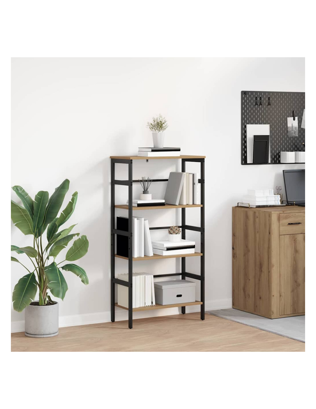 Questa libreria industriale è una vera chicca per chi ama il design moderno con un tocco di ruvido. Con linee nette e materiali grezzi, è l'aggiunta perfetta a home office, studi o soggiorni. Grazie alla sua solida struttura in legno ingegnerizzato e acciaio, unisce funzionalità e stile. I ripiani offrono spazio a volontà per libri, decorazioni e altre cose utili, mantenendo un aspetto sia elegante che pratico che si adatta a diverse atmosfere, dal urbano al rustico.