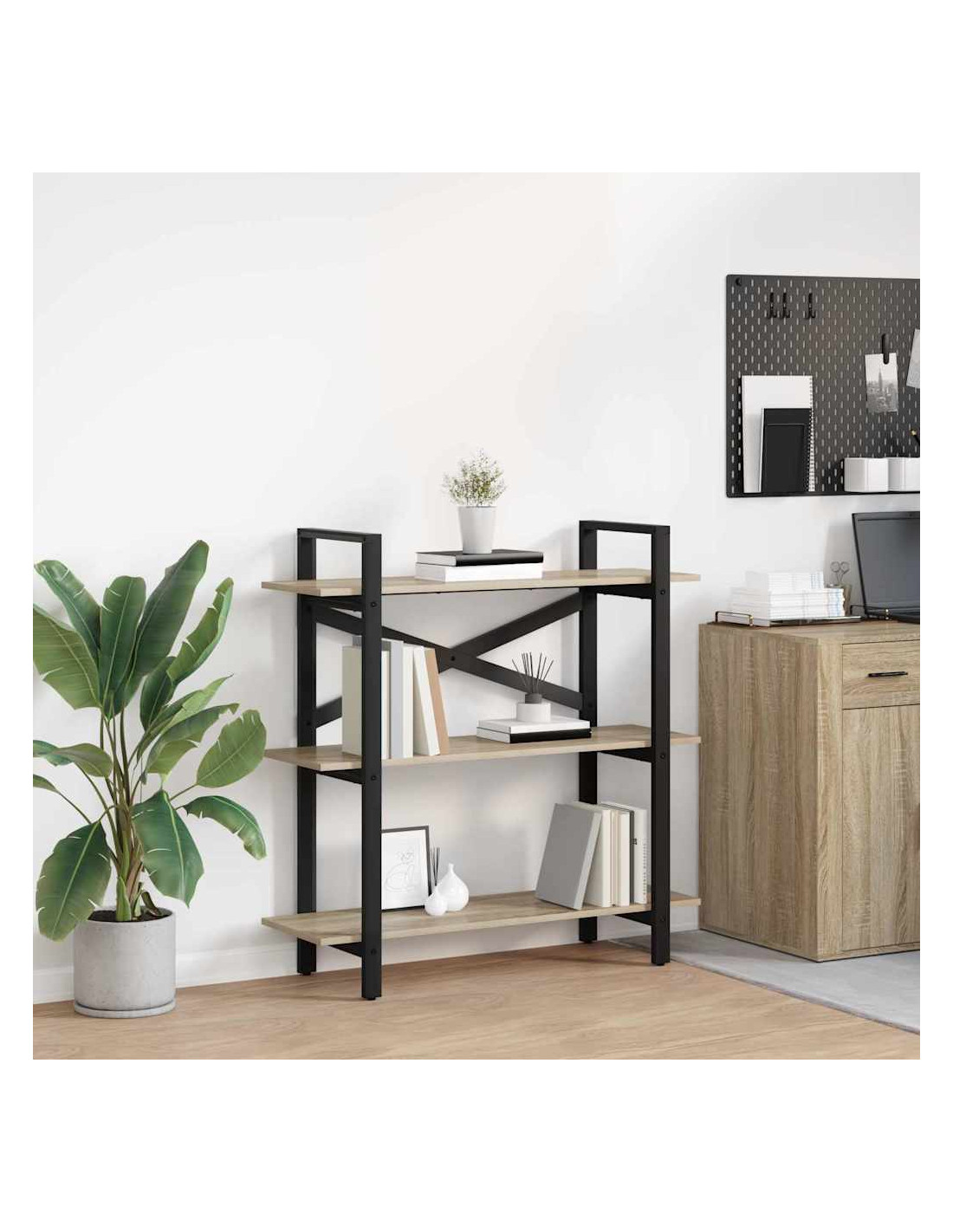 - Ripiani in legno ingegnerizzato: Questa libreria ha ripiani forti e belli realizzati in legno ingegnerizzato, scelto per la sua resistenza e stile. Sono perfetti per sostenere anche i libri più pesanti per lungo tempo.
