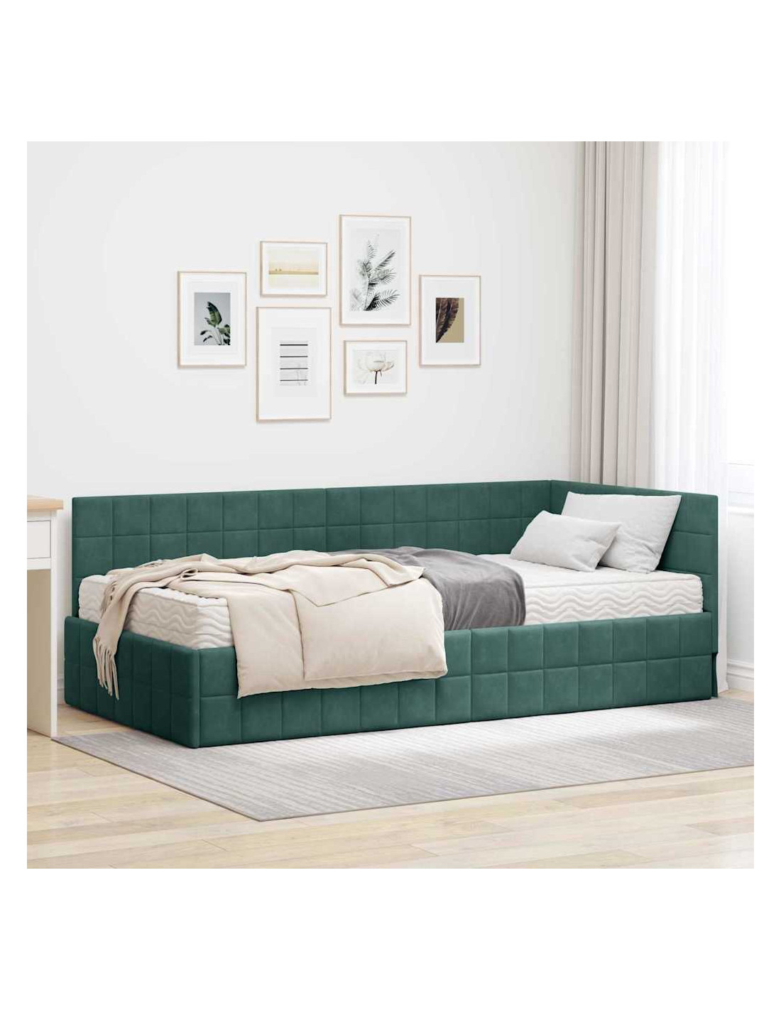 Questo letto angolare in velluto con materasso è l'ideale per chi cerca eleganza e comfort. La sua forma elegante e il velluto ricco lo rendono perfetto in ogni arredamento. Con un telaio a piattaforma robusto, offre una base sicura per un sonno sereno. Immagina di sdraiarti su un materasso in schiuma a media rigidità che accoglie ogni posizione per notti riposanti. La testiera a parete non solo risparmia spazio, ma migliora anche il design, rendendolo un punto di riferimento per il relax.