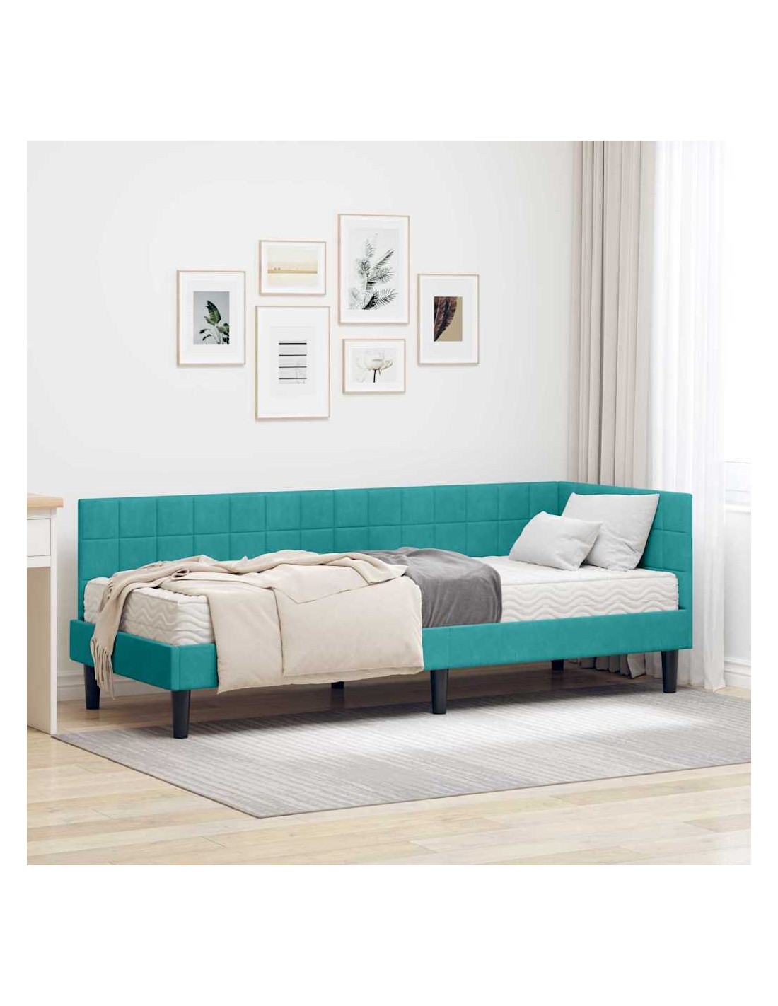 Questo letto angolare combina stile e praticità, adattandosi perfettamente a un arredamento moderno. La sua forma rettangolare è accompagnata da una finitura in velluto che aggiunge un tocco di classe alla tua camera.