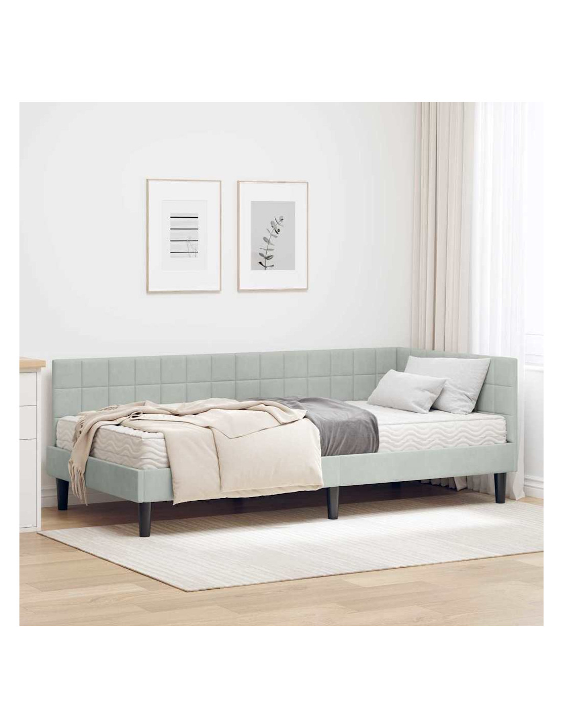 Questo letto angolare combina stile e praticità, adattandosi perfettamente a un arredamento moderno. La sua forma rettangolare è accompagnata da una finitura in velluto che aggiunge un tocco di classe alla tua camera.