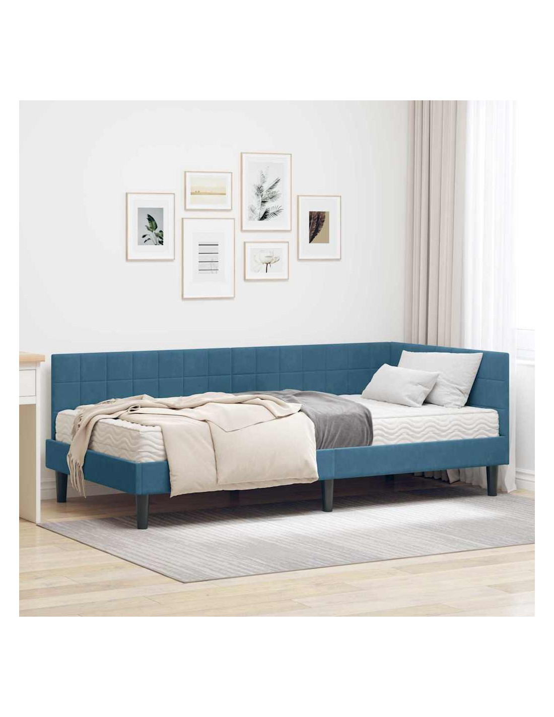Questo letto angolare combina stile e praticità, adattandosi perfettamente a un arredamento moderno. La sua forma rettangolare è accompagnata da una finitura in velluto che aggiunge un tocco di classe alla tua camera.