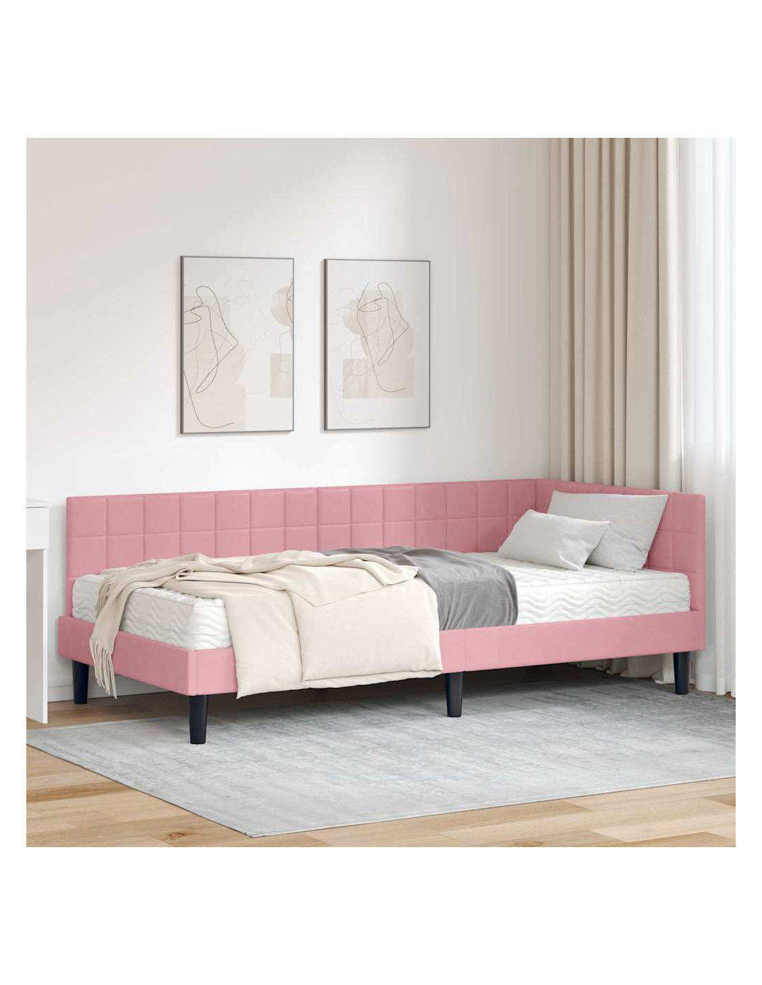 Questo letto angolare combina stile e praticità, adattandosi perfettamente a un arredamento moderno. La sua forma rettangolare è accompagnata da una finitura in velluto che aggiunge un tocco di classe alla tua camera.