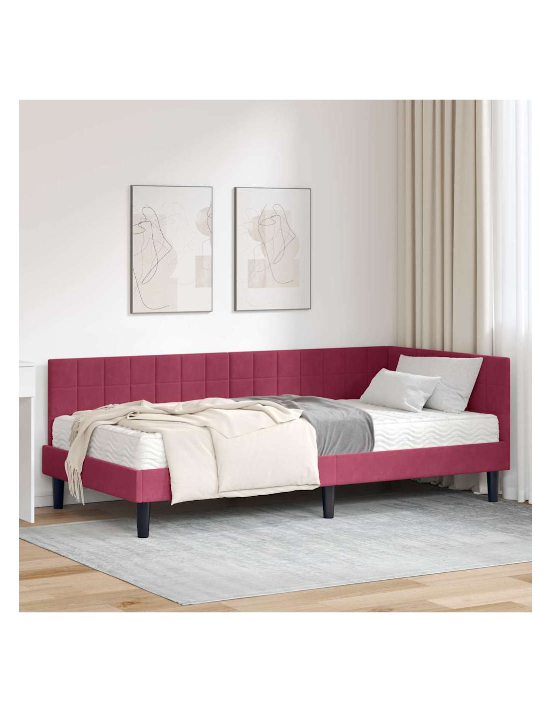 Questo letto angolare combina stile e praticità, adattandosi perfettamente a un arredamento moderno. La sua forma rettangolare è accompagnata da una finitura in velluto che aggiunge un tocco di classe alla tua camera.