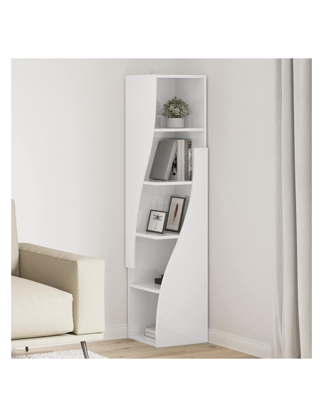 - Design angolare salvaspazio: Questo mobile angolare moderno ha scaffali progettati per sfruttare al massimo gli spazi piccoli. Ideale per chi ha poco spazio ma non vuole rinunciare a stile e funzionalità.