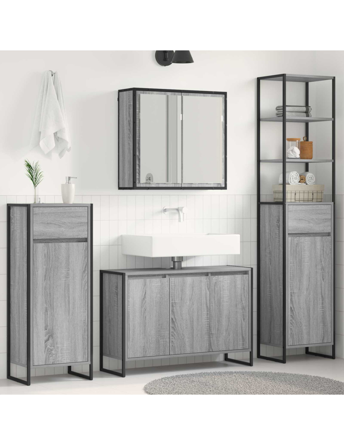 Questo set di mobili da bagno rappresenta davvero l'eleganza moderna, unendo con stile funzionalità e bellezza. È perfetto per spazi abitativi in città e offre soluzioni di stoccaggio efficaci, soddisfacendo le esigenze attuali con un design fluido e un aspetto raffinato. La combinazione di legno ingegnerizzato e acciaio rende il set resistente e pratico, adatto per un bagno alla moda.